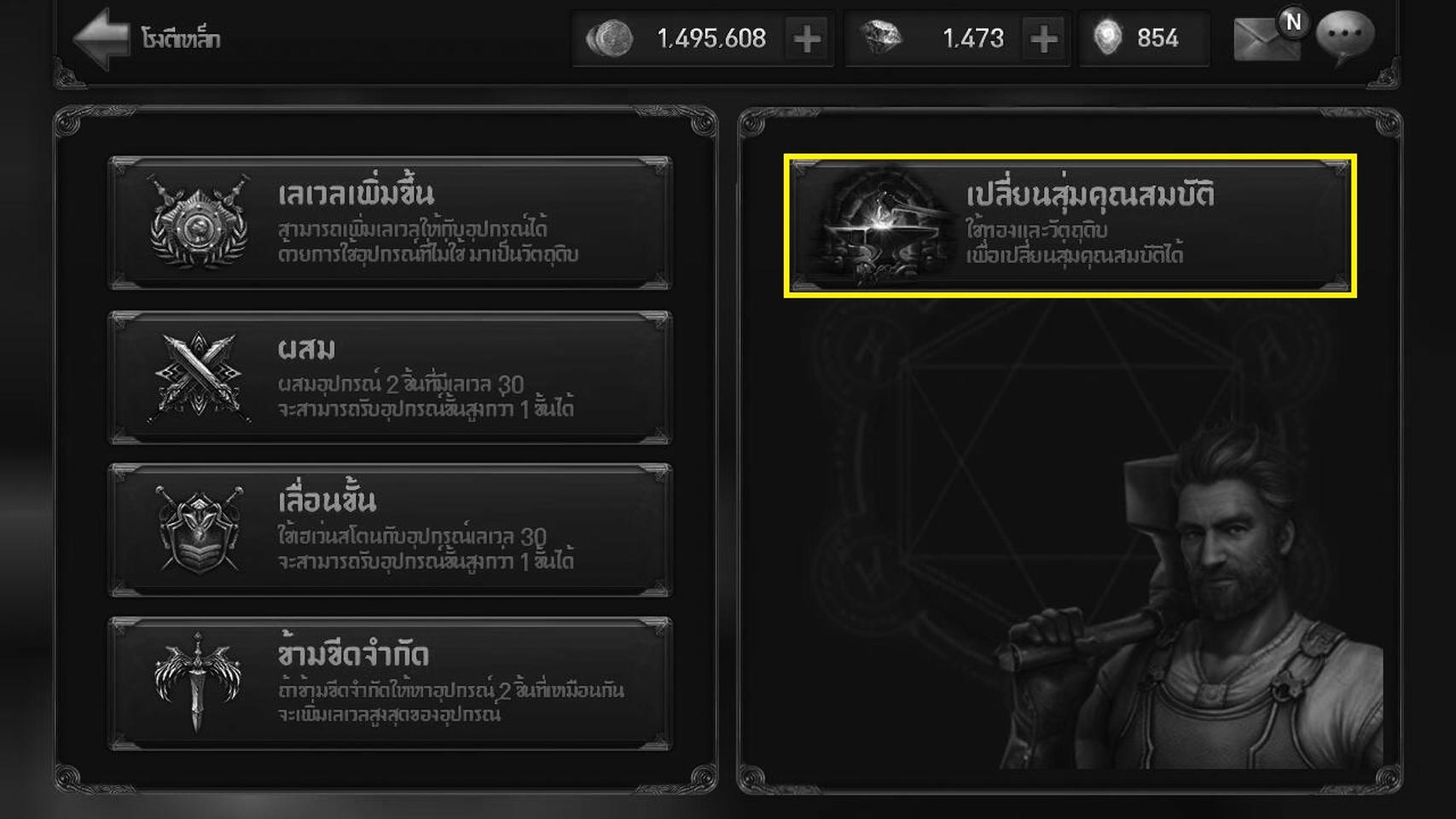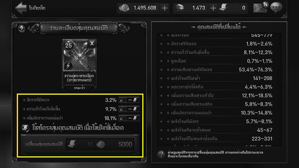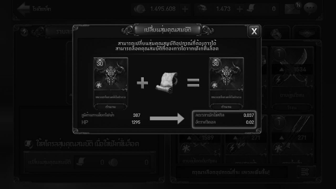 ยกตัวอย่าง) ต้องการเปลี่ยนพลังโจมตีไฟฟ้าระดับเทพเจ้า เมื่อทำการล็อคความเสียหายสกิลและคริติคอล ก็จำเป็นต้องใช้ 20,000 ทอง และ 40 สโครลสุ่มคุณสมบัติ จะสามารถเปลี่ยนคุณสมบัติพลังโจมตีไฟฟ้า เป็นความเร็วในการโจมตีได้เกี่ยวกับฟังก์ชั่นสุ่มคุณสมบัติ5. ฟังก์ชั่นบันทึกสมาชิกในสงครามกิลด์และโหมดล่ามังกร