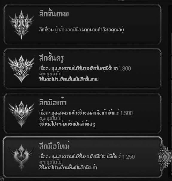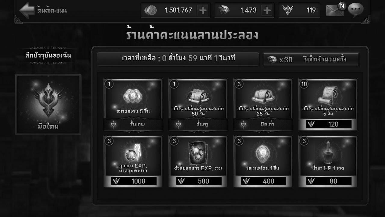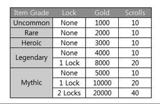 3. ร้านค้าคะแนน นั้นผู้เล่นสามารถซื้อไอเทมได้อย่างหลากหลายมากยิ่งขึ้น รวมถึงการซื้อตั๋วสุ่มคุณสมบัติได้ด้วยการใช้คะแนนลานประลอง ส่วนผู้เล่นที่อยู่ในลีกสูง ๆ สามารถซื้อไอเทมได้ในจำนวนที่มากขึ้นอีกด้วย 4. ระบบเปลี่ยนคุณสมบัติ คือ ระบบที่ผู้เล่นสามารถสุ่มคุณสมบัติของอุปกรณ์โดยใช้ทองและตั๋วสุ่มคุณสมบัติ สำหรับผู้เล่นที่ใช้ตั๋วสุ่มคุณสมบัติ สามารถเลือกใช้เพียงบางคุณสมบัติเพื่อคงคุณสมบัติของอุปกรณ์ ไปจนถึงสามารถอัพเกรดอุปกรณ์ตามที่ต้องการได้การใช้ทองและตั๋วเปลี่ยน แตกต่างกันไปตามระดับของไอเทม สามารถเช็คได้จากตารางด้านล่าง