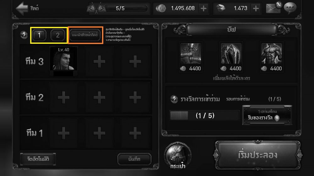 การอัพเดทครั้งนี้ ท่านสามารถบันทึกสมาชิกในสงครามกิลด์และล่ามังกรได้ข้อควรระวัง: สามารถเซ็ตติ้งสมาชิกกิลด์ทีมต่อสู้ได้ ยกเว้นหัวหน้ากิลด์ สำหรับกิลด์ทีมป้องกัน สามารถดูรายละเอียดได้ด้านล่าง กิลด์ทีมป้องกันในสงครามกิลด์ (จัดทีมโดยหัวหน้ากิลด์)
