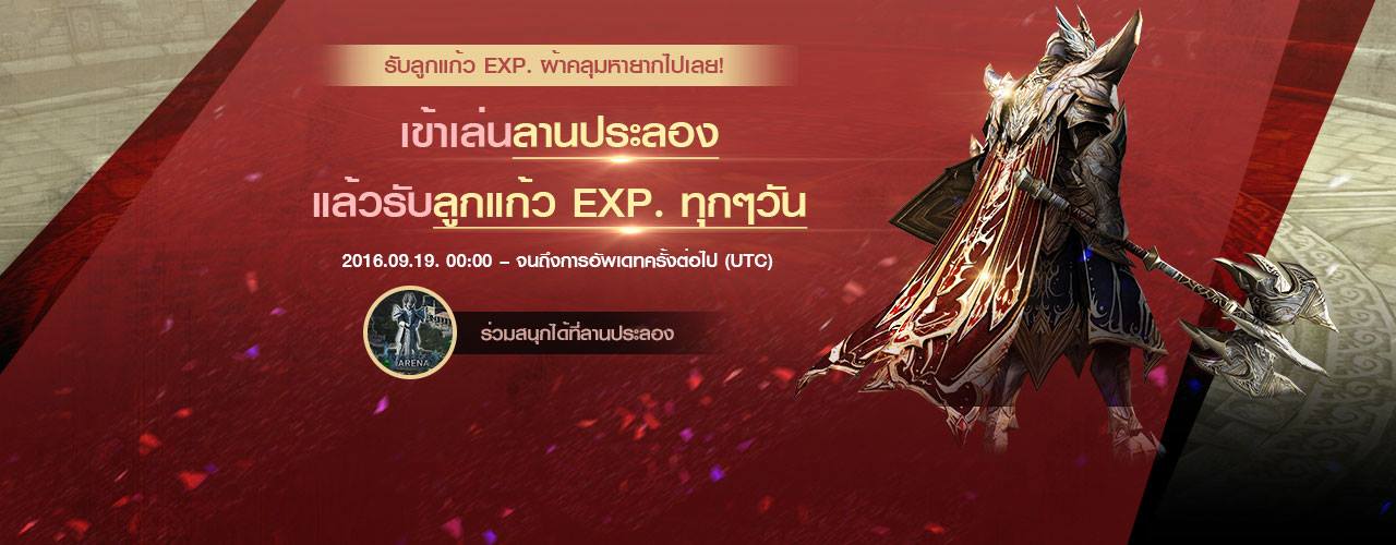 ผู้เล่นที่เล่นในลานประลองในช่วงวันที่ 19 -25 กันยายน จะได้รับ ลูกแก้ว EXP. ผ้าคลุมหายาก วันละ 1 ลูก ภายในช่วงระยะเวลากิจกรรมไปเลย ! เพียงแค่เข้าลานประลองวันละ 1 ครั้งแค่นี้เอง