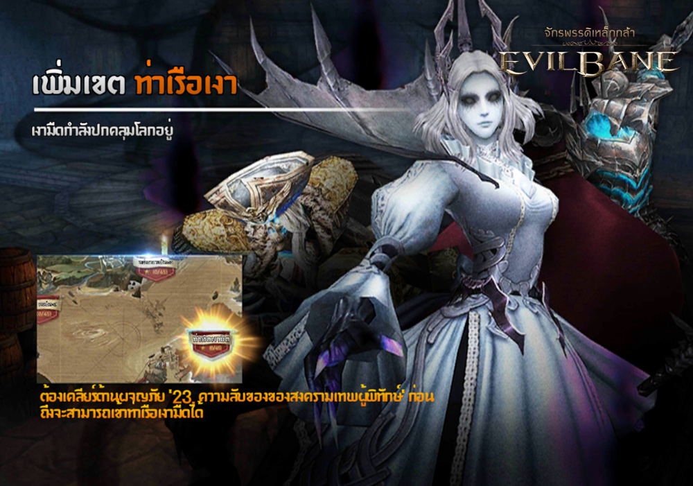 ฮัลโหลว ชาว Evilbane ทั้งหลาย เข้าหน้าฝนแล้ว บรรยากาศครึ้มๆ แบบนี้ ต้องนี่เข้ากับธีมที่จะอัพเดทใหม่มาก ! กับการอัพเดท ท่าเรือเงามืด ซึ่งเป็นแผนที่เขตใหม่ มาพร้อมกับความโหดของมอนสเตอร์เป็นเท่าตัวเลยทีเดียว เป้นการเตรียมตัวก่อนไปเจอกัน Season 2 นั่นเอง นอกจากนี้ยังมีอัพเดทอาวุธเวทมนตร์ชิ้นใหม่ทั้ง 3 อาชีพ ได้แก่ ลุค,คาร่า,วัลโก้ อีกด้วย กรี๊ดดด !! มาดูกันเลยว่ามีรายละเอียดอะไรกันบ้างจ้าเป็นแผนที่ที่โหดจริง แต่ของรางวัลที่ได้ก้คุ้มนะ เพราะเราสามารถหาผ้าคลุมและอุปกรณ์อื่นๆได้ที่นี่ด้วย ซึ่งมีเงื่อนไขว่าจะต้องผ่านเนื้อเรื่องใน Season 1 ตอนที่ 23 “ความลับของผู้ที่ถูกเลือก” ก่อน ถึงจะมาได้จ้า