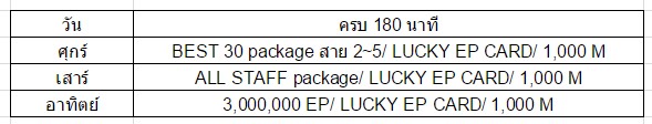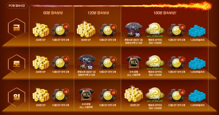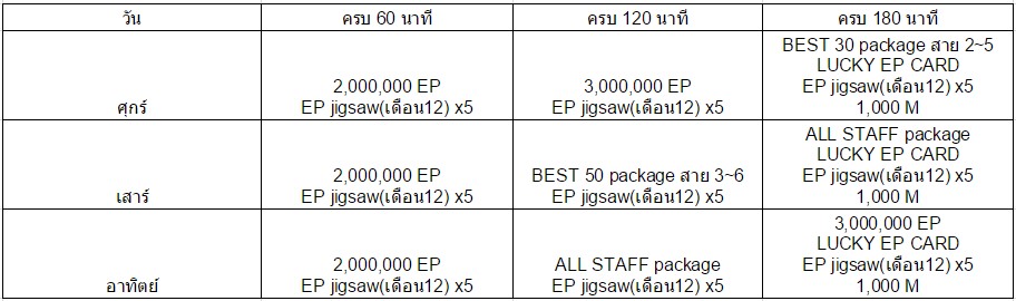 กิจกรรมสำหรับผู้ที่เล่นบนเครื่องPC(ที่บ้าน) ภายในวันศุกร์, เสาร์, อาทิตย์นี้เท่านั้น โดยเมื่อล็อคอินเข้าเกมครบ 180 นาทีจะได้รับรางวัล ดังนี้