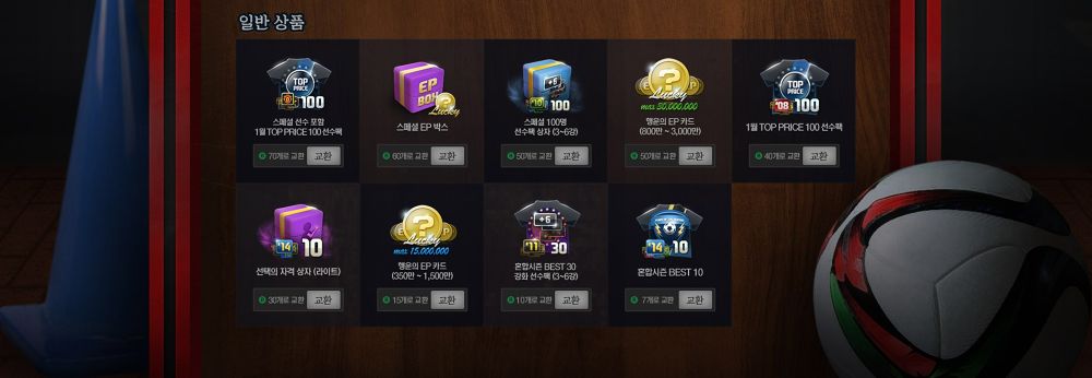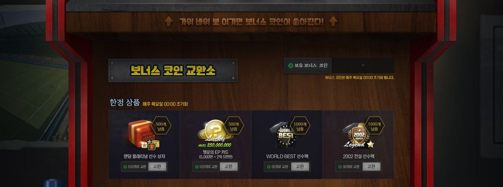 - ใช้ Bonus Coin 50 เหรียญ แลกรับ Special Player Box โดยคัดเลือกนักเตะจาก 100 คน(ค่าพลัง +3 ถึง +6)
