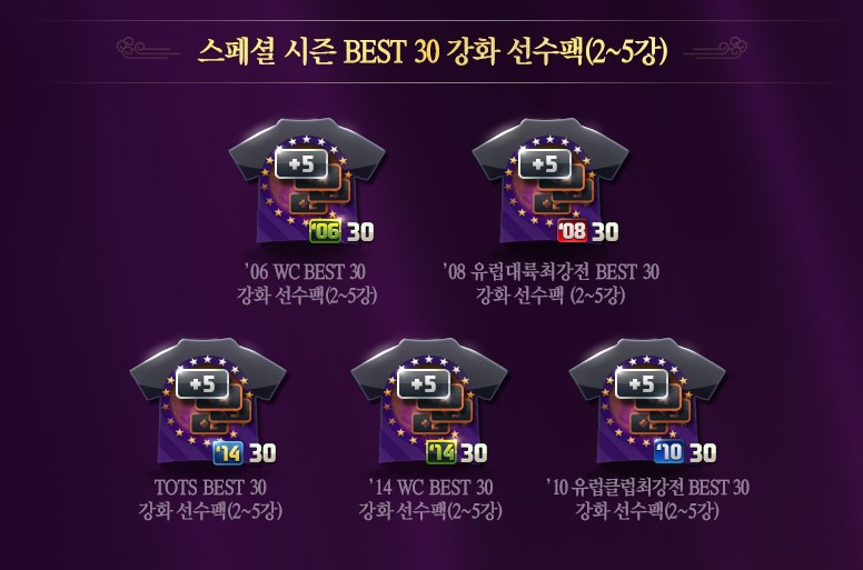 - ‘14 WC BEST 30 package โดยคัดเลือกนักเตะจาก 30 คน **ค่าพลัง +2 ถึง +5
