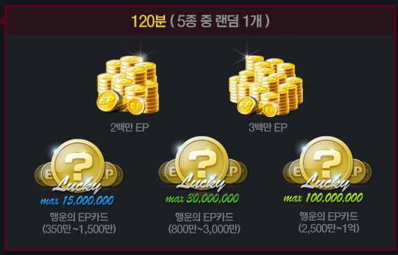 - Lucky EP Card จำนวนตั้งแต่ 25,000,000 ~ 100,000,000 EP