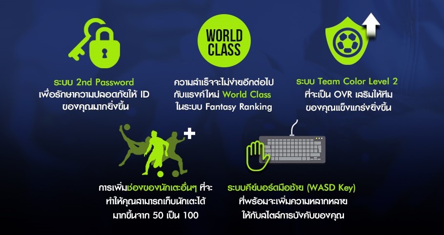 - ช่องของนักเตะอื่นๆ จาก 50 เป็น 100 ช่อง หมดปัญหา พื้นที่ไม่พอเก็บนักเตะหลากหลายสไตล์ หรือ เปิดการ์ดยังไม่ทันสนุกช่องดันเต็ม