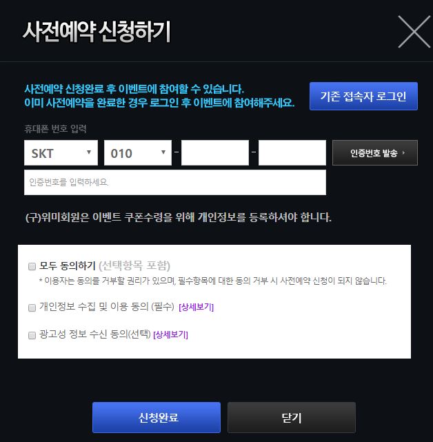 สำหรับผู้ที่ ลงทะเบียนล่วงหน้า จะได้รับไอเทมเล็กๆน้อยๆเป็นการตอบแทนและ มีสิทธ์ลุ้นรางวัลต่างๆอีกมายมายเลยทีเดียว ซึ่งแน่นอนครับว่าในไทยอาจจะลำบากสักหน่อย เพราะการลงทะเบียนต้องใช้เบอร์ของเกาหลีซึงหากใครมีคนรู้จักที่อยู่เกาหลี อาจจะสบายสักหน่อยแต่ถ้าไม่มีล่ะก็คงเป็นงานยากสักนิดที่จะลงทะเบียนกับเกมนี้