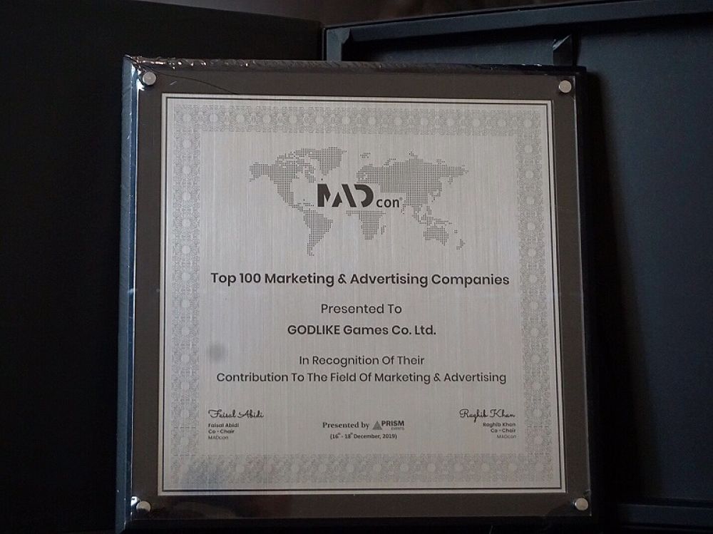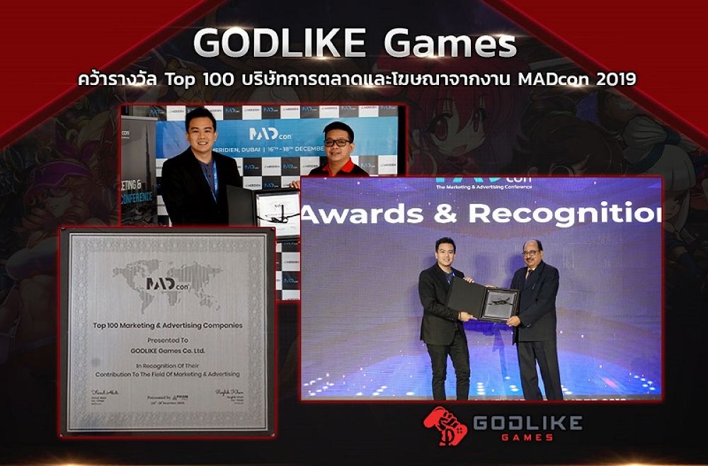 ด้วยความสำเร็จเหล่านี้ ทางสมาคม The Marketing and Advertising Conference (MADcon) จึงได้จัดให้บริษัท ก๊อดไลค์ เกมส์ จำกัด ติดอันดับ 100 บริษัทชั้นนำของโลก ที่ได้รับรางวัล Top 100 Marketing & Advertising Companies ของปี 2019 นี้ไปครอง