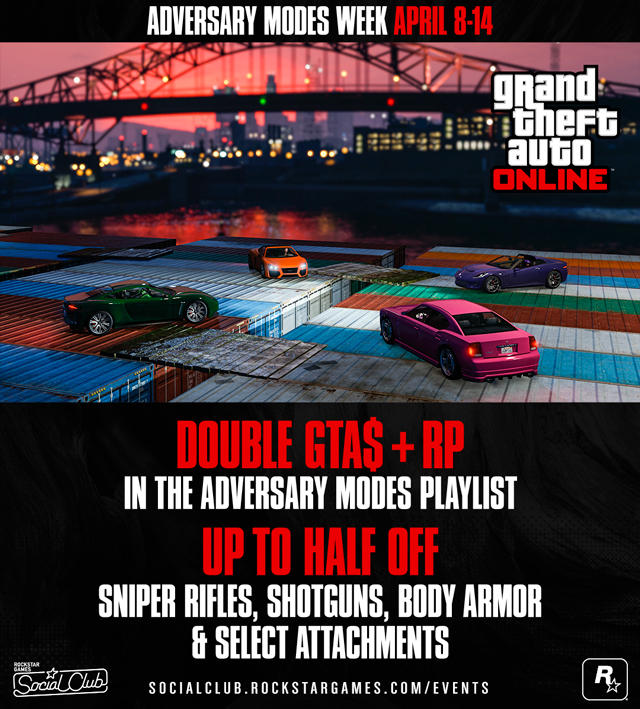 Grand Theft Auto Online เกมจำลองการเป็นวายร้ายสุดฮิตที่ปล่อยออกมาให้เราได้เข้าไปเล่นกับเพื่อนตั้งแต่ปีที่แล้ว ซึ่งล่าสุดทาง Rockstar Games ได้ประกาศเกี่ยวกับการอัพเดต โหมด Adversary ตัวใหม่ ซึ่งโหมดตัวนี้มีชื่อว่า Inch By Inch ซึ่งเรานั้นจะได้เล่นกันในวันที่ 12 เมษายน 2559 ที่จะถึงนี้และทางผู้พัฒนาได้บอกว่าวันที่ 8-14 เมษายนนี้ จะมีกิจกรรม เงินและ RP*2 ,ปืนลดราคาและเพิ่มรถใหม่ด้วย