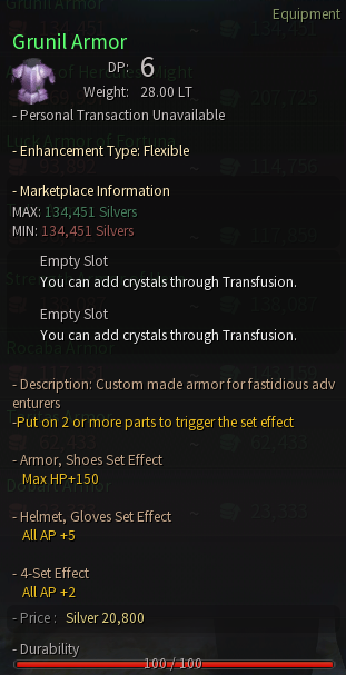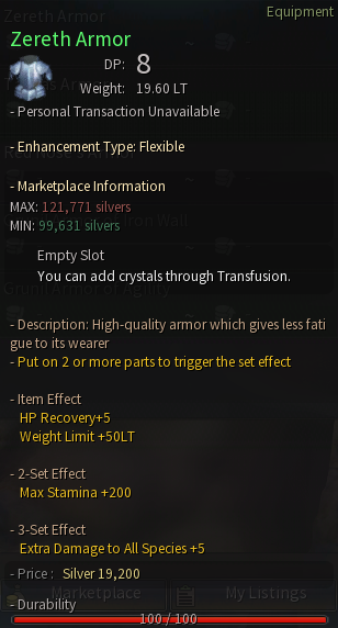 เป็นชุดเกราะสำหรับสายฟาร์มของเป็นอย่างมาก ส่วนรายละเอียดมีดังต่อไปนี้- ชุดเกราะ Set นี้สามารถติดตั้งอัญมณีได้ 2 ช่อง- สวมใส่ครบ 2 ส่วนจะเพิ่มน้ำหนักให้ตัวละคร 150 Point- สวมใส่ครบ 3 ส่วนจะเพิ่มน้ำหนักให้ตัวละคร 50 Pointอย่างที่ทราบกันว่าเกมนี้น้ำหนักมีผลต่อตัวละครเป็นอย่างมาก แถมส่วนใหญ่ไอเท็มภายในเกมก็มีน้ำหนักทั้งนั้น โดยเฉพาะ เงิน [Gil] แถมใครที่ยังไม่พร้อมจะเติม Cash Shop เพื่อซื้อที่เพิ่มน้ำหนักตัวละคร ชุดเกราะ Set นี้จึงเหมาะเป็นอย่างมากที่จะมาช่วยในส่วนนี้ค่ะ ปกติแล้วผู้เล่นส่วนใหญ่จะสวมชุดเกราะนี้เพียงแค่ 2 ส่วนเท่านั้น เพราะการที่จะใส่ 3 ส่วนน้ำหนักที่ถูกเพิ่มขึ้นมาเพียงแค่ 50 แต้มดูมันน้อยเกินไป ดังนั้นอาเจ๊นัทแนะนำว่าเลือกใส่แค่ 2 ส่วนพอค่ะ
