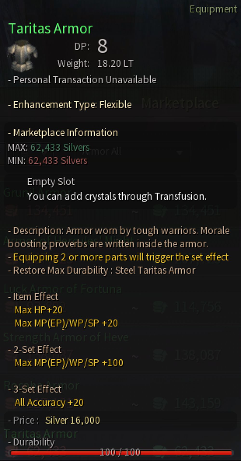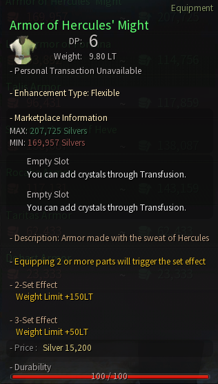 - ส่วนหัวจะเพิ่มป้องกันการการล้มและลอย, ส่วนเกราะจะเพิ่ม Max HP 20 Point กับ Max MP, WP และ SP 20 Point, ส่วนมือจะเพิ่มความแม่นยำ [Accuracy] 8 Point และ ส่วนเท้าจะเพิ่มค่าหลบหลีทุกรูปแบบ [All Evasion]หมายเหตุ: ชุดเกราะ Set นี้สามารถอัพเกรดให้เป็น Steel Taritas Set ได้มาถึงชุดเกราะ Set สุดท้ายที่อาเจ๊นัทจะแนะนำให้เพื่อนๆ ได้รู้จักกันนะคะ ชุดเกราะ Set นี้ถือได้ว่าเป็นชุดที่เพิ่มความสามารถให้ตัวละครในทุกๆ ด้าน แต่อาจจะไม่ได้โดดเด่นเท่าไหร่นัก ถ้ามองถึงประสิทธิภาพต่างๆ แต่อย่างน้อยมันก็เป็นชุดเกราะที่น่าสนใจในช่วงเริ่มเกมเท่านั้นจริงๆ ถ้าให้อัพเกรดไปขั้นสูงๆ ดูยังไงก็ไม่คุ้มทุ่นเท่าไหร่ค่ะสรุปแล้วอาเจ๊นัทเลือกใส่ Set ไหนงั้นหรอ!? อาเจ๊นัทใส่ Grunil Set ส่วนหัวกับมือเพื่อเพิ่มพลังโจมตี แล้วไปใส่เกราะกับเท้าของ Hercules’ Might Set เพิ่มเพิ่มน้ำหนักตัวละครค่ะ เรียกว่า Set นี้ใส่เก็บเลเวลฟาร์มกันยาวๆ ได้เลย!!!สังคมเกมคนไทยเล่น Black Desert ของเซิร์ฟเวอร์ไต้หวัน [TW] คลิ๊กที่นี่