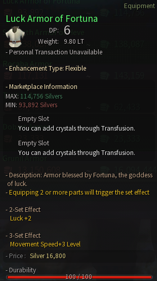 เป็นอีกหนึ่งชุดเกราะสำหรับสายฟาร์มของที่ต้องอาศัยโชคและการเคลื่อนไหวที่รวดเร็ว ส่วนรายละเอียดมีดังต่อไปนี้- ชุดเกราะ Set นี้สามารถติดตั้งอัญมณีได้ 2 ช่อง- สวมใส่ครบ 2 ส่วนจะเพิ่มสเตตัสโชค [Luck] ให้ตัวละคร 2 เลเวล- สวมใส่ครบ 3 ส่วนจะเพิ่มสเตตัสความเร็วในการเคลื่อนที่ [Movement Speed] ให้ตัวละคร 3 เลเวลสำหรับเกม Black Desert จะมีสเตตัสพิเศษที่ช่วยเพิ่มความสามารถให้ตัวละคร ค่าโชคและเพิ่มความเร็วในการเคลื่อนที่ก็จัดอยู่ในนั้นด้วย ซึ่งเราสามารถติดตั้งให้ Max Level สูงสุดที่ขั้น 5 มาพูดถึงค่า Luck กันก่อนค่าพลังตัวนี้จะช่วยทำให้ไอเท็มต่างๆ ไม่ว่าจะเป็นทั้งขยะ รวมไปถึงแรร์ไอเท็มต่างๆ ดรอปได้ง่ายขึ้น ซึ่งถ้าติดตั้งจนถึงเลเวล 5 สิ่งที่เห็นได้ชัดเจนเลยก็คือของที่ได้ง่ายมากขึ้นอย่างเห็นได้ชัด ส่วน Movement Speed ก็คือการเพิ่มความเร็วในการเคลื่อนที่ มันจะไปเห็นผลก็ต่อเมื่อเลเวล 4 หรือ 5 ซะมากกว่า ดังนั้นชุดนี้ถามว่าคุ้มค่าที่จะสวมใส่ไหม เอาเพียงแค่ 2 ส่วนเพิ่มโชคก็พอค่ะ แต่ถ้าให้อาเจ๊นัทแนะนำเลือก Set อื่นจะดีกว่าเยอะ