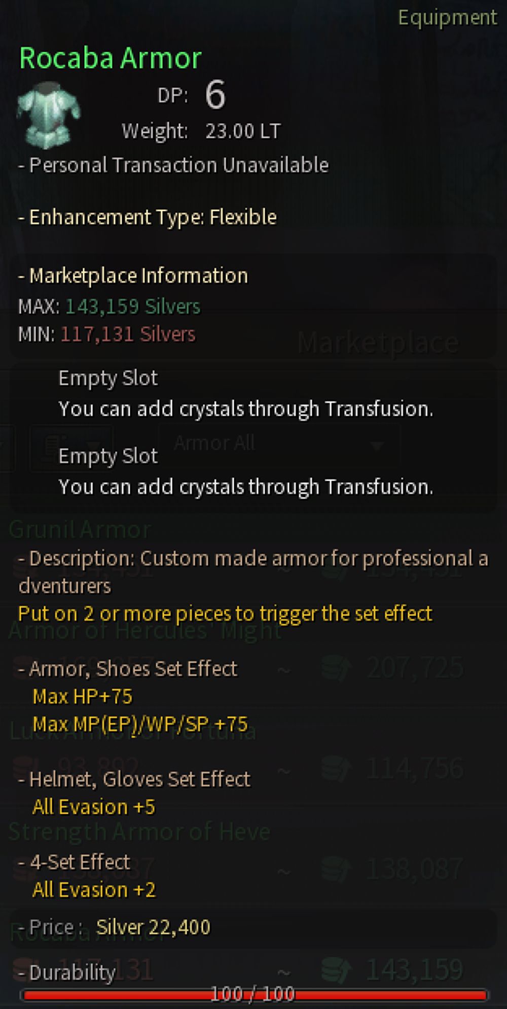 มาถึงชุดเกราะที่ใครอยากจะเลือดเยอะๆ ก็ต้อง Set นี้เลยค่ะ ส่วนรายละเอียดมีดังต่อไปนี้- ชุดเกราะ Set นี้สามารถติดตั้งอัญมณีได้ 2 ช่อง- สวมใส่ครบ 2 ส่วนจะเพิ่ม Max HP 250 Point- สวมใส่ครบ 3 ส่วนจะเพิ่ม Max HP 50 Pointเป็นชุดเกราะที่ถูกออกแบบมาให้มีน้ำหนักที่เบาแถมยังเพิ่มเลือดให้กับตัวละครสูงมากเลยทีเดียวค่ะ บางคนอาจจะมองว่ามันน้อยนะ แต่จริงๆ แล้ว 250 แต้มก็ถือว่าเยอะเมื่อเลเวลสูงๆ แต่ส่วนใหญ่ชุดเกราะ Set นี้กลับไม่ได้รับความนิยมเท่าที่ควร เพราะถ้าเทียบกับความคุ้มค่าแล้วเอาไปเพิ่มพลังโจมตีหรือป้องกันส่วนอื่นๆ จะโอเคมากกว่า