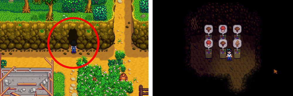 ในตอนแรกถ้ำนี้จะเป็นเพียงถ้ำเปล่าๆ แต่เมื่อรายได้ของฟาร์มถึง 25000g แล้ว Demetrius จะมาหาที่ฟาร์มเพื่อบอกว่าเค้ากำลังทำวิจัยอยู่ และจะให้เราเลือกว่า อยากให้ถ้ำนี้กลายเป็น ถ้ำค้างคาว หรือ ถ้ำเห็ด