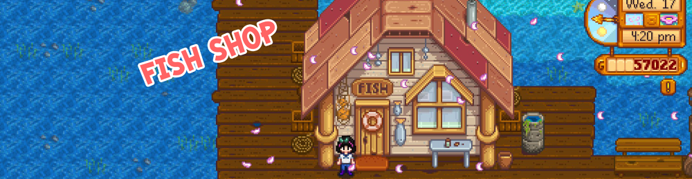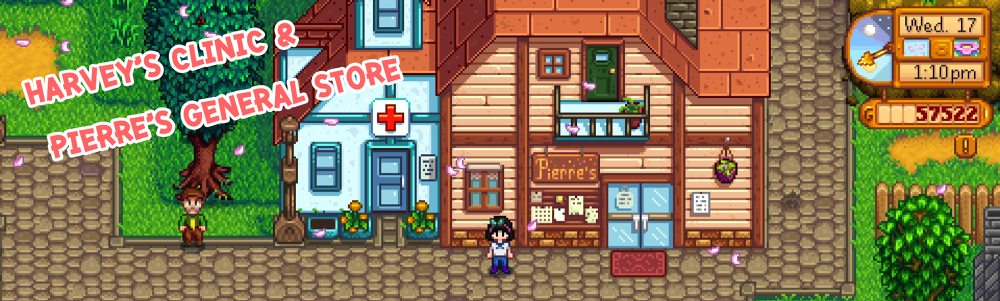 ร้านขายของชำที่เพื่อนๆรู้จักกันดี ที่นี่ขายเมล็ดพืชตามฤดู และกระเป๋าเป้เพิ่มความจุช่องเก็บของของเรา (ขั้นแรกราคา 2000g เพิ่มความจุกระเป๋าเป็น 24 และขั้นที่2 ราคา 10000g เพิ่มความจุกระเป๋าเป็น 36)