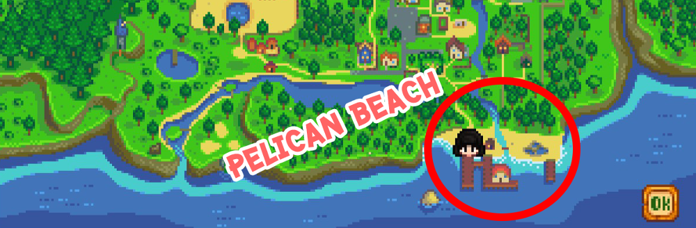 ชายหาดของเมือง สวรรค์ของนักตกปลา ในแมพนี้จะมีหอย และเปลือกหอยให้เก็บ แถมยังเป็นแหล่งตก Crimsonfish หนึ่งในปลา Legendary ด้วยนะ