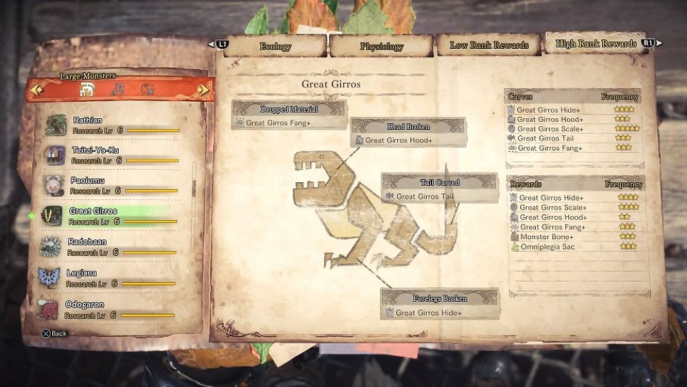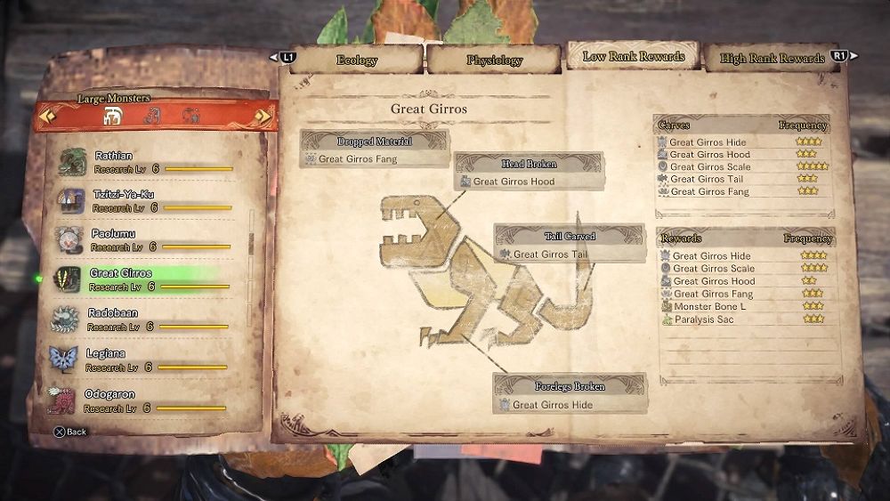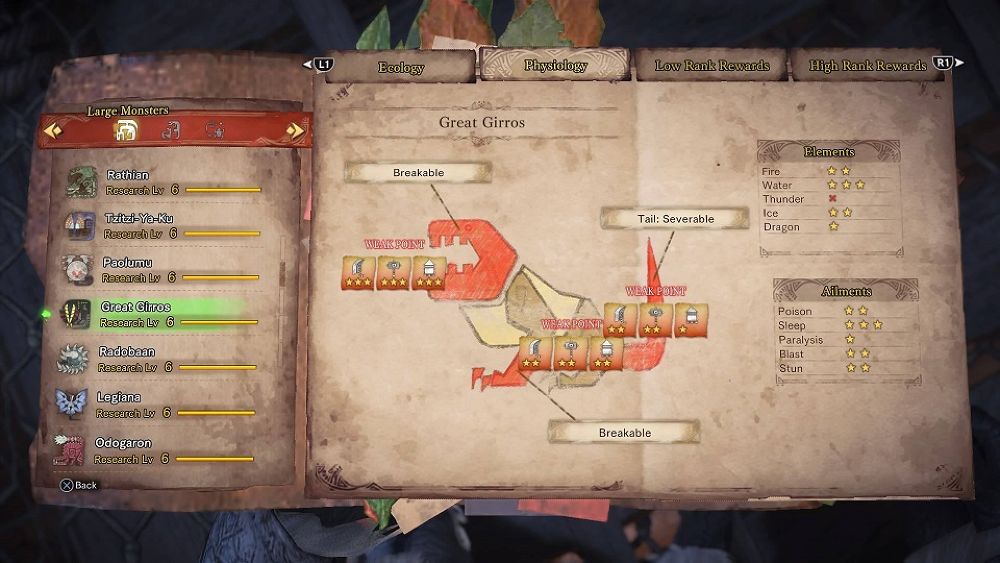 จุดอ่อนของ Great Girros จะอยู่บริเวณส่วนหัว, ขาหน้า และ หาง ซึ่งส่วนที่สร้างความเสียหายอย่างหนักก็คือบริเวณหัวค่ะ โดยหางเราสามารถตัดให้ขาดได้ และส่วนที่สามารถทำลายให้แตกหักได้ก็คือบริเวณหัวและขาหน้า ทำให้มีโอกาสที่เราจะได้ชิ้นส่วนหายากจากมันอีกด้วย เรื่องการแพ้ธาตุของเจ้า Great Girros ก็คือธาตุน้ำจะสร้างความเสียหายมากที่สุด ส่วนสถานะผิดปกติแนะนำว่าให้ยิงปืนยสลบก็จะทำให้มันหลับได้ เป็นสถานะที่มีโอกาสติดมากที่สุด ส่วนสถานะผิดปกติอื่นๆ อยู่ในระดับกลางๆ ค่ะ