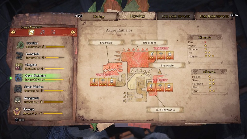 จุดอ่อนของ Rathalos และ Azure Rathalos จะมีทั้งหมด 3 ส่วนด้วยกันคือส่วนหัว, ส่วนปีก และ ส่วนหาง โดยส่วนหัวจะสร้างความเสียหายได้อย่างรุนแรงมากที่สุด โดยหางสามารถตัดให้ขาดได้ โดย Rathalos จะแพ้อาวุธที่มีธาตุมังกรรุนแรงที่สุด รองลงมาก็คือธาตุสายฟ้า ส่วน Azure Rathalos ก็เช่นเดียวกันแพ้อาวุธที่มีธาตุมังกรหนักที่สุด รองลงมาก็คือธาตุน้ำแข็ง ส่วนสถานะผิดกติต่างๆ เหมือนกันทั้งสองตัว แต่ก็ถือว่าติดน้อยกว่ามอนสเตอร์ตัวอื่นๆ สุดท้ายนี้มีเทคนิคถ้ามันกำลังบินขึ้นไปฟ้าเพื่อหนีหรือโจมตีให้รีบยิง Flash Pod ไปทันทีจะทำให้มันร่วงลงมา จากนั้นเรารุมโจมตีเข้าไปที่หัวอย่างหนักได้เลยค่ะ