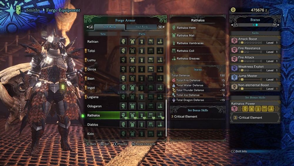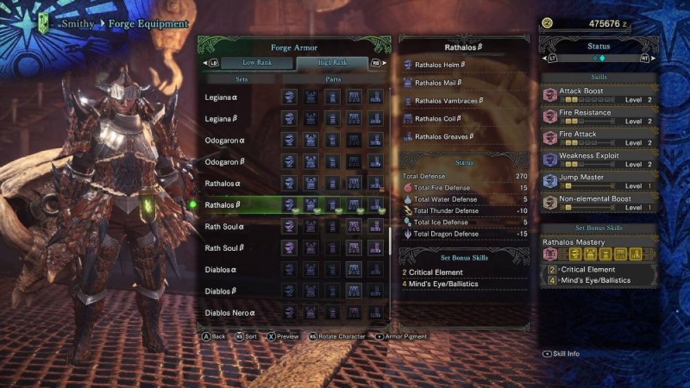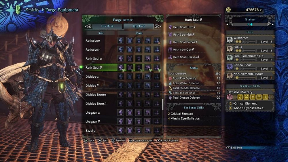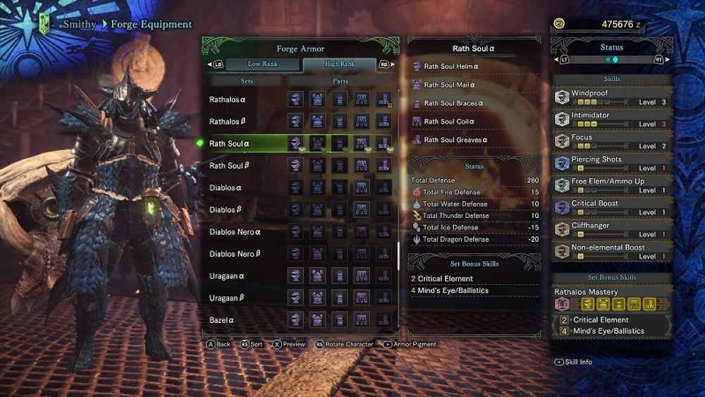 ชุดเกราะของ Rathalos จะมีทั้งหมด 3 Set ด้วยกันคือ Rathalos Armor Set, Rathalos Alpha Armor Set (α) และ Rathalos Beta Armor Set (β) ส่วน Pink Rathian จะมีทั้งหมด 2 Set ด้วยกันคือ Rath Soul Alpha Armor Set (α) และ Rath Soul Beta Armor Set (β)