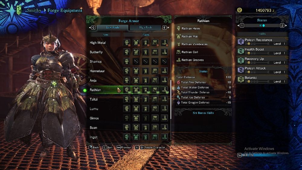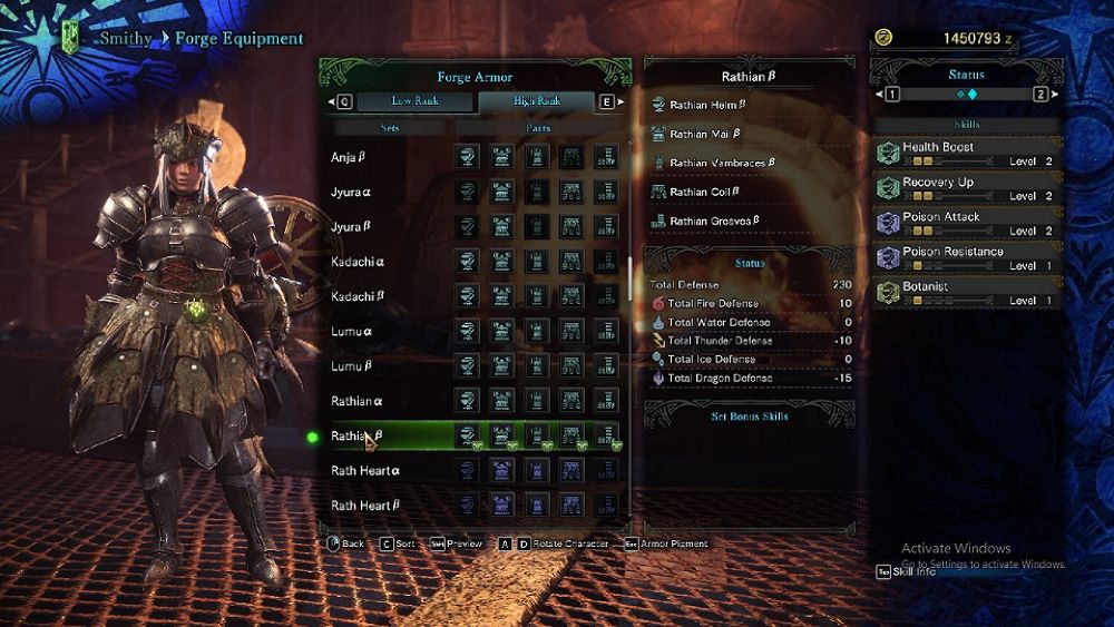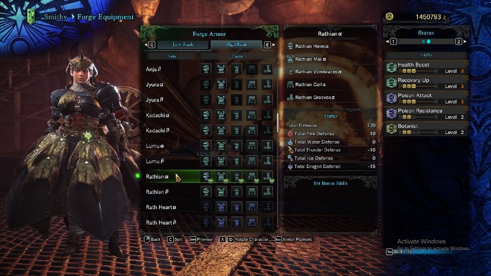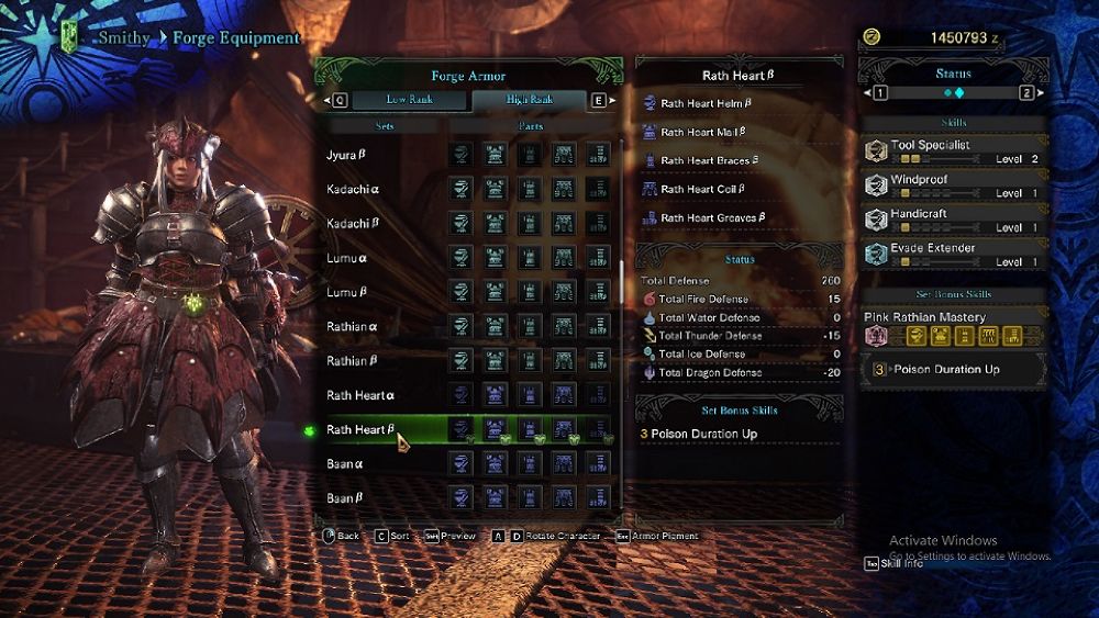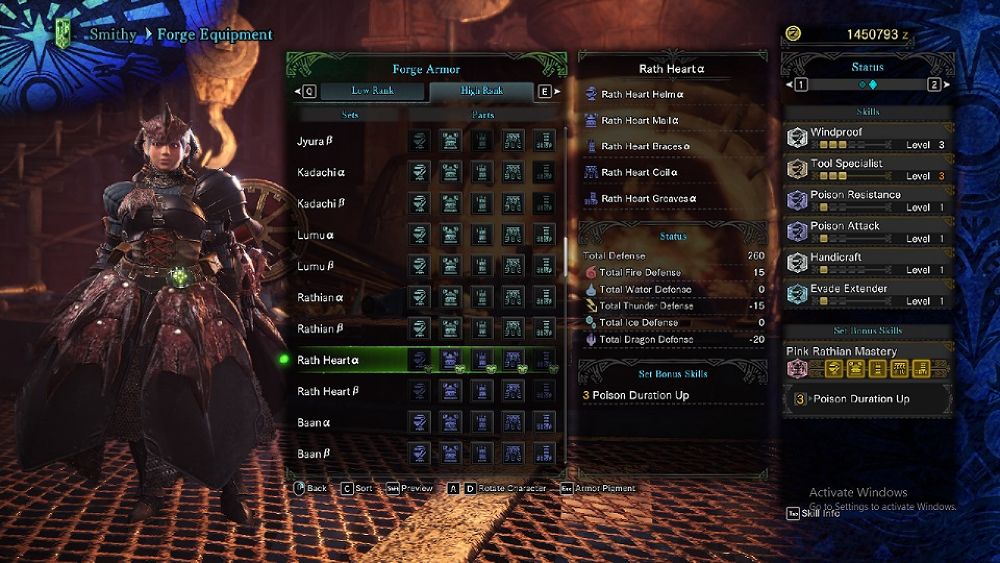 ชุดเกราะของ Rathian จะมีทั้งหมด 3 Set ด้วยกันคือ Rathian Armor Set, Rathian Alpha Armor Set (α) และ Rathian Beta Armor Set (β) ส่วน Pink Rathian จะมีทั้งหมด 2 Set ด้วยกันคือ Rath Heart Alpha Armor Set (α) และ Rath Heart Beta Armor Set (β)