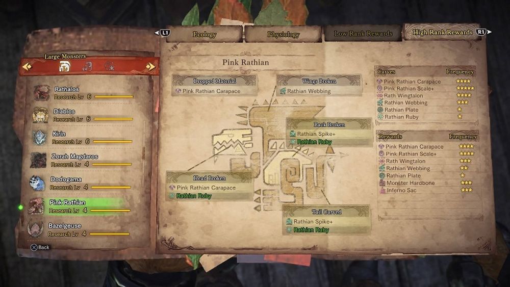 "อัตราการดรอปไอเท็มจาก Pink Rathian ในแบบ High Rank"