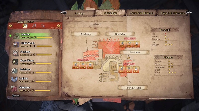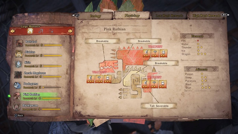 จุดอ่อนของ Rathian และ Pink Rathian จะมีทั้งหมด 3 ส่วนด้วยกันคือส่วนหัว, ส่วนปีก และ ส่วนหาง โดยส่วนหัวจะสร้างความเสียหายได้อย่างรุนแรงมากที่สุด โดยหางสามารถตัดให้ขาดได้ ส่วนที่สามารถทำลายได้ก็จะมีทั้งหมด 3 ส่วนคือหัว, ปีก และ บริเวณลำตัว เรียกว่าถ้าเราทำลายได้สำเร็จก็มีโอกาสได้ชิ้นส่วนหายาก