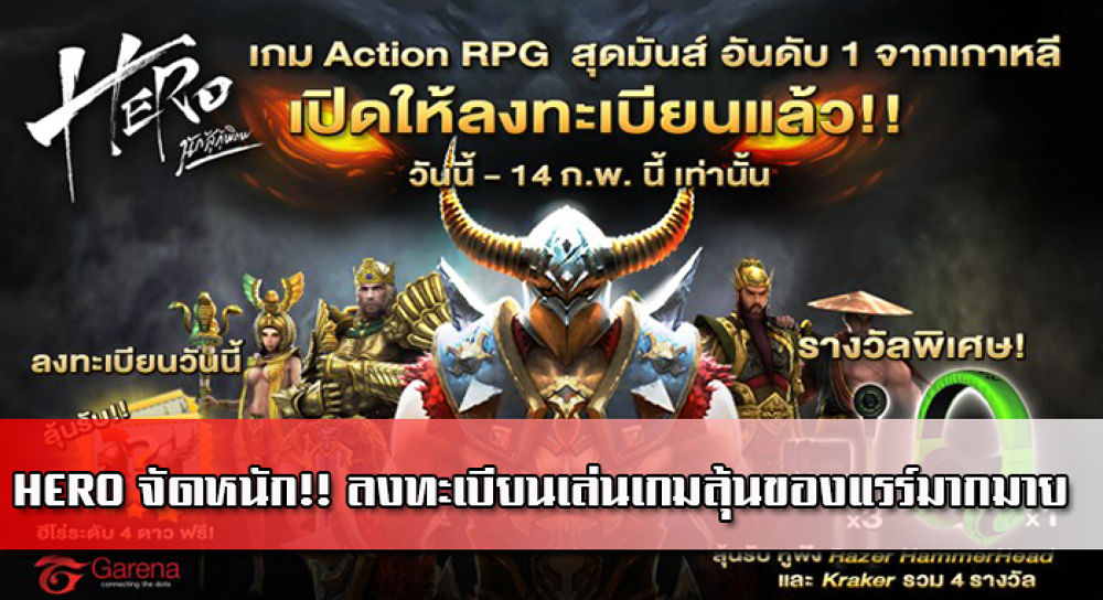 หลักจากปิด CBT กันไปเป็นที่เรียบร้อยนะครับ สำหรับเกม HERO นักสู้กู้พิภพ จากทางค่าย Garena Thailand สำหรับเกมนี้หากใครที่ยังไม่รู้จัก จะบอกให้อีกครั้งคร่าว เกมนี้เป็นเกมแนว Action RPG ที่เราผู้เล่นจะได้รับบทเป็น แม่ทัพ ที่ต้องคอยบริหารจัดการปาร์ตี้ของ ฮีโร่ และเหล่าวีรชน หรือพวกขุนพลดังๆ ในตำนาน คอยนำพวกเค้าออกไปต่อสู้กับเหล่าปีศาจร้ายที่หมายจะยึดครองโลก... ภายในเกมยังมีคอนเท้นท์ต่างๆน่าเล่นอีกมากมาย ไม่ว่าจะเป็นการผจญภัย ,ปีนหอ 100 ชั้น 1,000 ชั้นก็ว่าไป ,PvP โหมดสุดมันส์ ขอยกระบบมาคร่าวๆละกัน ส่วนในเรื่องของภาพกราฟฟิคในเกม ผมก็คงต้องบอกเลยว่ามันสวยมาก รายละเอียดต่างๆทำมาดีเลยทีเดียว และยังเป็นเกมที่เคยติดท็อปๆเกาหลีมาแล้วด้วย แถมตอนนี้ก็ไปไกลถึง Season 2 กันไปแล้ว เอาล่ะ..จะไม่โม้มากละ จะขอเข้าเรื่องเลยละกัน ทางผู้ให้บริการเกม HERO นักสู้กู้พิภพ ตอนนี้เค้าได้เปิด ให้เหล่าผู้เล่นไปลงทะเบียนเกมนี้ เพื่อรอคอยวันเปิดจริงในเร็วๆนี้กัน อ่ะฮ่าา..แน่นอนว่าไม่ได้เปิด ลงทะเบียนกันธรรมดาๆ ยังมีสิทธิ์ลุ้นรับของแรร์แจ่มๆอีกด้วย เรียกได้ว่า มาลงทะเบียนเล่นเกมง่ายๆแล้ว ยังมีโอกาสลุ้นของอีก โดยมีรายละเอียดและของรางวัลมีอะไรกันบ้างไปดูกันเลยย...