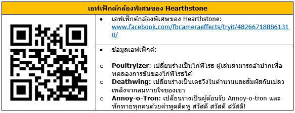 ► Hearthstone ปล่อยเอฟเฟ็กต์กล้องใหม่ที่พร้อมให้ผู้เล่นทุกคนเปลี่ยนร่างของตนเองเป็นตัวละครสุดเท่ห์สามตัวในเกม! เลนส์ของกล้องจะมีสามเอฟเฟ็กต์ที่แตกต่างกันประกอบด้วยเอฟเฟ็กต์ The Poultryizer (ปืนพลังไก่), Deathwing (เดธวิง) และ Annoy-o-Tron (แอนนอย-โอ-ทรอน)! กล้องจะมาพร้อมกับเอฟเฟ็กต์และเสียง อย่าลืมเปิดเสียงเพื่อสัมผัสประสบการณ์เต็มรูปแบบ!