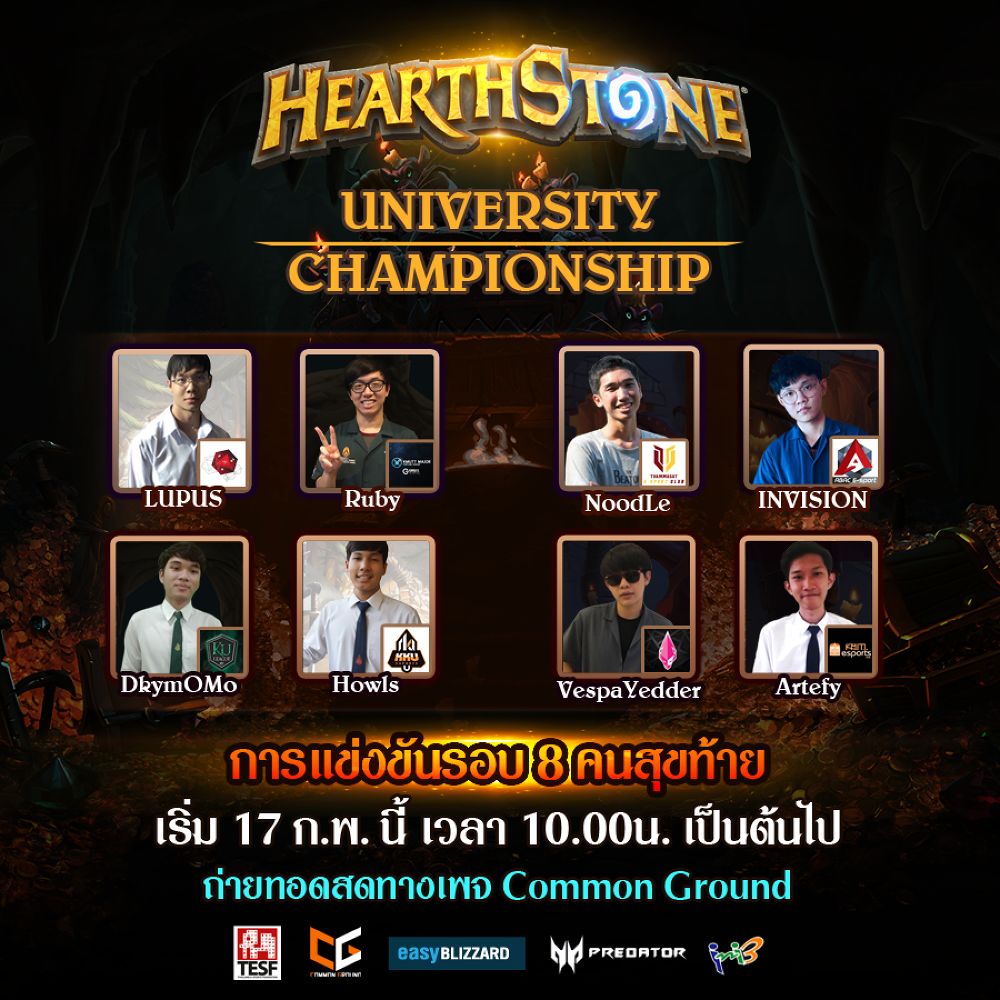 Hearthstone University Championship รอบตัดเชือก! การแข่งขันเพื่อเฟ้นหาสุดยอดผู้เล่นตัวแทนมหาวิทยาลัยชิงแชมป์ประเทศไทย จากผู้เข้าแข่งขันนักศึกษามหาวิทยาลัยทั่วประเทศ โดยในรอบไฟนอลนี้ได้คัดเหลือเพียง 8 ผู้เข้าแข่งขันสุดแกร่ง จาก 8 มหาวิทยาลัยชั้นนำ และจะมีเพียง 1 เดียวเท่านั้นที่สามารถชิงตำแหน่งแชมป์ระดับประเทศ คว้าเงินรางวัลรวมกว่า 50,000 บาท ร่วมเชียร์และรับชมถ่ายทอดสดการแข่งขันเพื่อศักดิ์ศรีครั้งนี้ได้ในวันที่ 17 กุมภาพันธ์ 2561 ตั้งแต่เวลา 10.00 น. เป็นต้นไป ผ่านทางแฟนเพจเฟซบุ๊ก Common Ground