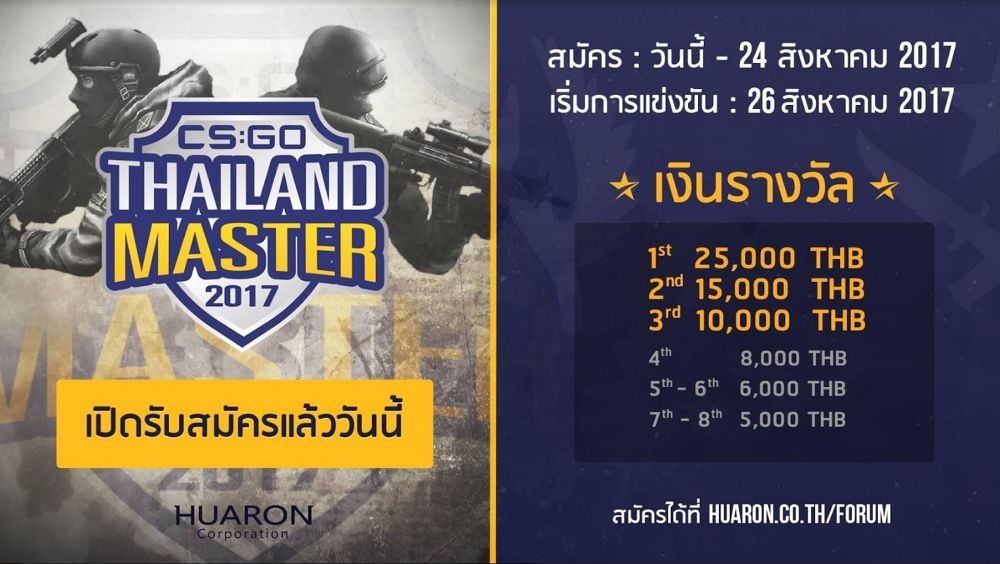 Huaron Corporation เชิญชวนเพื่อนๆเข้าร่วมการแข่งขัน CS:GO Thailand Master 2017 เพื่อเฟ้นหาทีมที่เป็นที่สุดของประเทศไทย โดยการแข่งขันแบ่งออกเป็น 2 Seasonด้วยกันโดยใน Season 1 จะแข่งในช่วงเดือน สิงหาคม ตุลาคม ส่วน Season 2 เป็นช่วงเดือน ตุลาคม ธันวาคม แต่ละ Season ชิงเงินรางวัลรวมกว่า 80,000 บาท ซึ่งใน Season 2 จะมีเงินรางวัลพิเศษให้ด้วยหากสามารถเป็นแชมป์ 2 สมัยติดต่อกัน หรือ เอาชนะแชมป์จาก Season 1 ได้