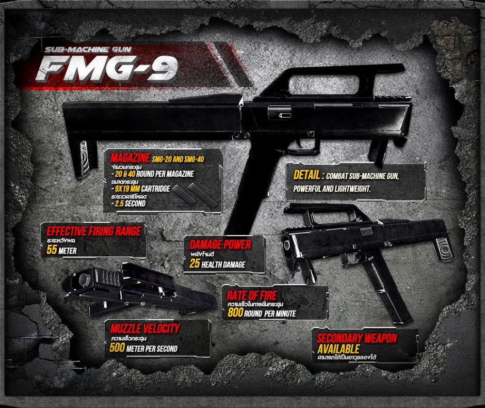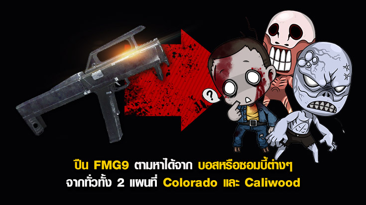 ► เพิ่มปืนใหม่เข้าสู่เซิร์ฟเวอร์ FMG9 ปืนกลรุ่นเล็กกระทัดรัด พลังโจมตีอยู่ที่ 25 Damage ความพิเศษอยู่ที่มันสามารถติดตั้งได้เป็นทั้งปืนหลัก หรือปืนรองก็ได้ น้ำหนักเบา ถึงแม้ว่าความแรงจะไม่ได้เยอะโดดเด่นอะไร แต่ก็มาพร้อมกับอัตราการลั่นกระสุนที่เร็วพอสมควร ซึ่งก็มากพอที่จะทำให้สามารถเสริมความโหดของปืนนี้ได้มากยิ่งขึ้น โดยผู้เล่นสามารถตามหาเจ้าปืนนี้ได้กับบอสหรือซอมบี้ต่างๆ จากทั่วทั้ง 2 แผนที่ Colorado และ Caliwood วันนี้เป็นต้นไป!