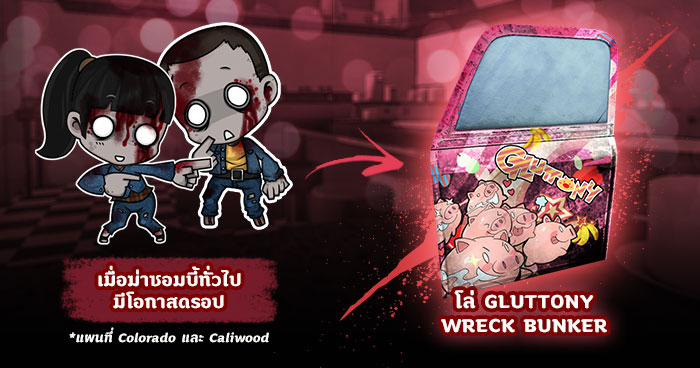 ► เมื่อผู้เล่นฆ่า ซอมบี้ทั่วไป ทั้ง 2 แผนที่ Colorado และ Caliwood มีโอกาสได้รับโล่ Gluttony Wreck Bunker ฟรี