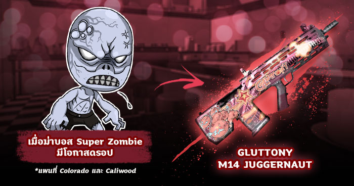 ► เมื่อผู้เล่นฆ่าบอส Super Zombie ทั้ง 2 แผนที่ Colorado และ Caliwood มีโอกาสได้รับปืน Gluttony M14 Juggernaut ฟรี