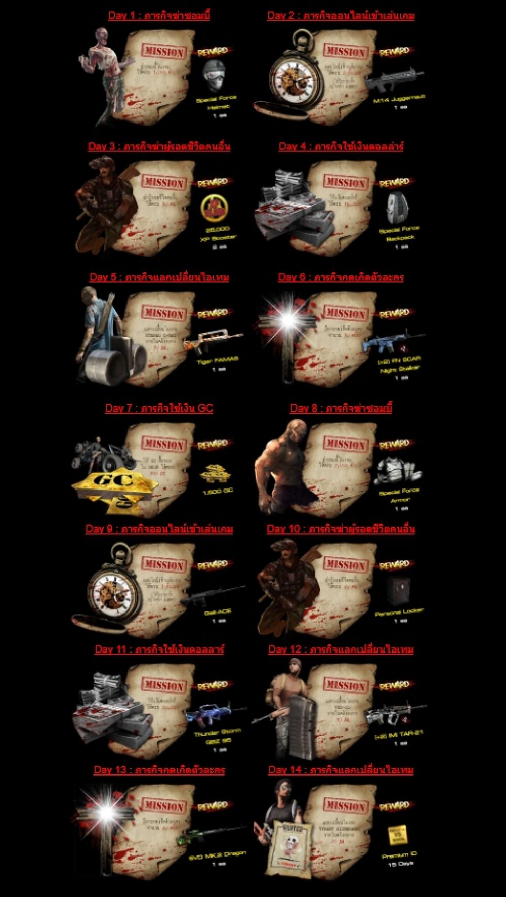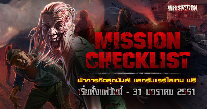 เชิญเหล่าผู้รอดชีวิตมาร่วมฝ่าดงภารกิจสุดมันส์! เพื่อแลกรับ ไอเทมพรีเมี่ยม และ GC ฟรี!!! พร้อมรางวัลอื่นๆอีกมากมาย ตลอดเดือนมกราคม 2561 ตั้งแต่วันที่ 10 ( เวลา 14.30น. ) – 31 ( เวลา 23.59น. )