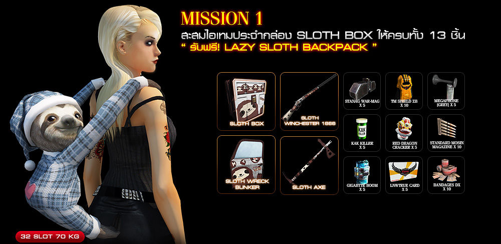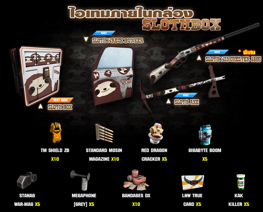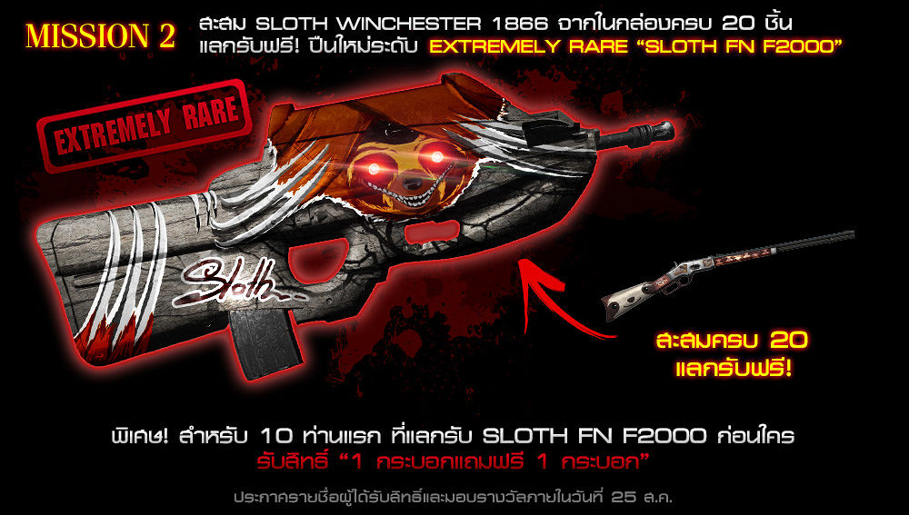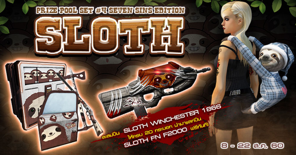 ในช่วงระยะเวลาที่เปิดจำหน่ายปืน Sloth Winchester 1866Limited Edition จะมีความโหดเพิ่มมากขึ้นแบบจัดเต็มเพิ่มพลังโจมตี ความเร็วการรัวกระสุน และพังยากสุดๆ โดยหลังจากวันที่ 22 ส.ค. 60 คุณสมบัติของปืนจะถูกปรับให้กลับเป็นปกติ!นอกจากนี้ยังมีกิจกรรมพิเศษสำหรับผู้ที่ซื้อกล่องSeven Sins Sloth Collection กับ2 ภารกิจสะสมไอเทมตามที่กำหนดแลกรับแรร์ไอเทมLazy Sloth Backpack และ ปืน SlothFN F2000 ไปเลยฟรีๆ
