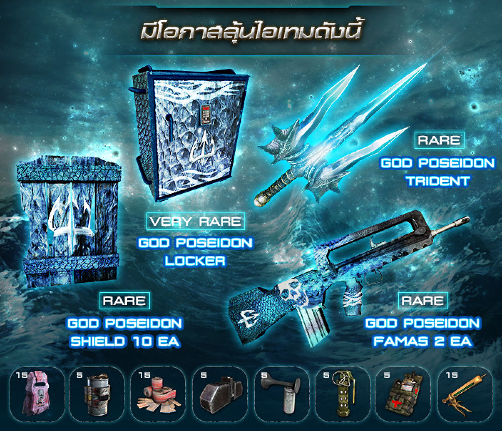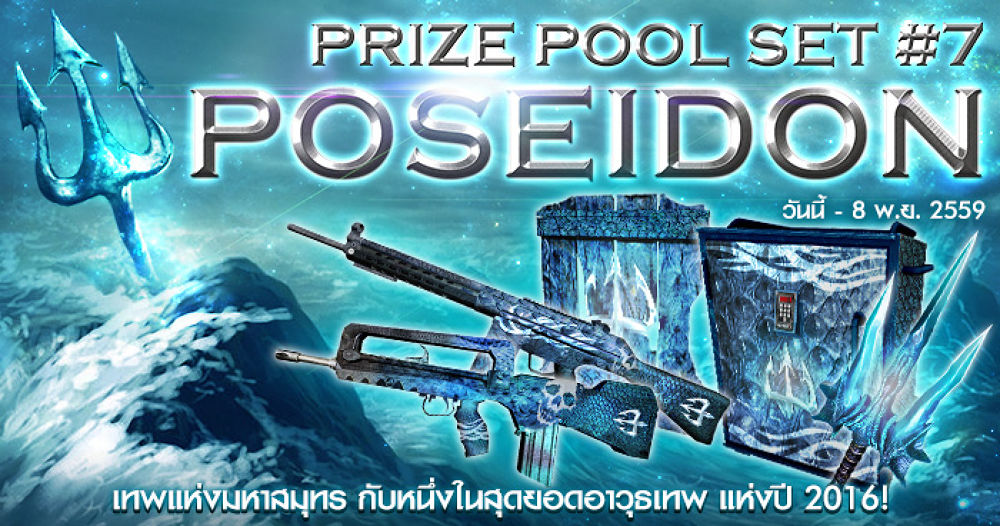 อีกครั้งกับปรากฎการณ์ครั้งสำคัญของวงการ E-Sport ไทย กับกล่องสุ่ม Prize Pool ปี 2016 Theme GOD Edition ที่ได้แรงบันดาลใจจากพลังของเหล่าทวยเทพที่แข็งแกร่งทั้งหลาย และเมื่อผนวกเข้ากับสุดยอดศาสตราวุธแห่งสงครามแล้ว จึงกลายเป็น Prize Pool Set สุดพิเศษ ซึ่งผู้ที่ร่วมสนับสนุน นอกจากจะได้รับไอเทมแรร์มากมายแล้ว รายได้ส่วนหนึ่งจากยอดขาย จะถูกสมทบเพิ่มเข้าไปในยอดเงินรางวัลของการแข่งขัน Infestation Thailand Championship 2016 อีกด้วยมาถึงกล่องสุ่มสุดยอดเซ็ตเทพ Prize Pool กล่องที่ 7 กับTheme " God Poseidon " เทพผู้เป็นเจ้าแห่งมหาสมุทรอันกว้างใหญ่ ที่มาพร้อมกับปืน HK G3 ดีไซน์ลายใหม่ โหดเท่ ไม่ซ้ำใคร แฝงไปด้วยพลังของเทพโพไซดอน และอาวุธเฉพาะตัวสามง่ามคู่กายที่โหดเหนือใครๆ เปิดให้สุ่มลุ้นเป็นเจ้าของกับสุดยอดมหาเทพเซ็ต เพียงครั้งละ 200 GC เท่านั้นน!• เริ่มกิจกรรม :: 25 ตุลาคม 2559 เวลา 17.00 น.