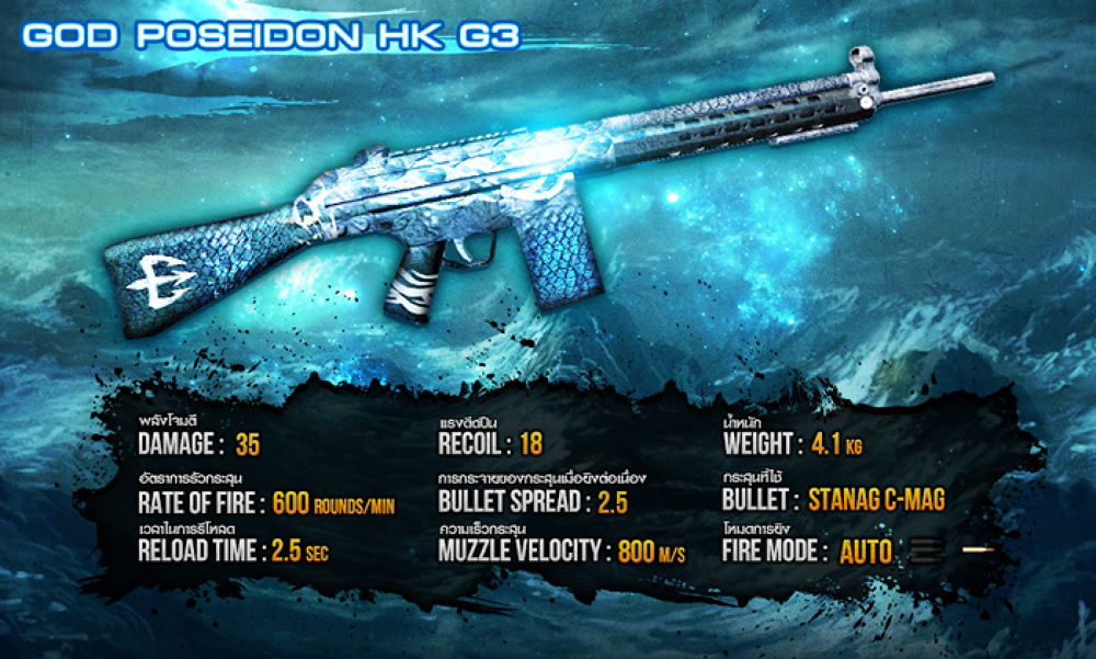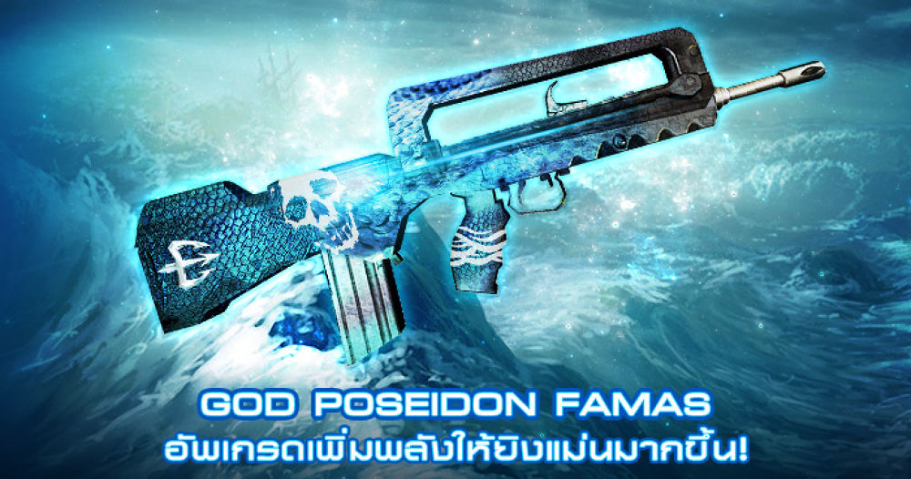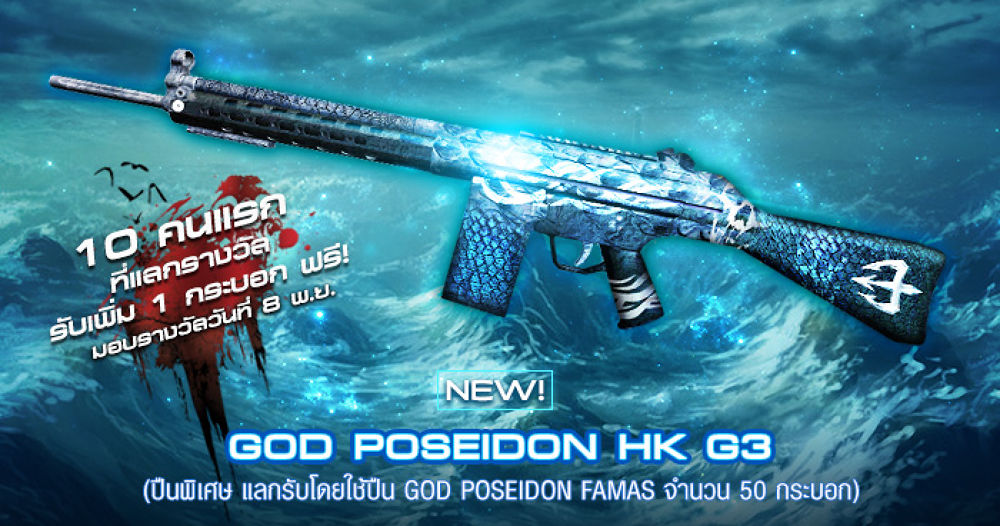 • สิ้นสุดกิจกรรม :: 8 พฤศจิกายน 2559 เวลา 23.59 น.• ผู้เล่นสามารถกดกล่องสุ่ม โดยคิดการเปิดครั้งละ 200 GC • ไอเทมที่เปิดได้จะถูกส่งไปที่คลังกลางในเกม (Global Inventory) ซึ่งสามารถเปิดได้ที่หน้าเลือกตัวละคร หรือภายใน Safe Zone • หากอยู่ในเกมต้องออกจากเกม แล้วเข้าเกมใหม่อีกครั้ง ไอเทมถึงจะแสดงในคลังนอกจากนี้ผู้ที่ได้ครอบครองจะได้พบกับคุณสมบัติพิเศษสุดเทพ!! ในปืน God Poseidon Famasที่ถูกอัพเกรดเพิ่มพลังความโหดแบบจัดเต็ม ให้ยิงแม่นเพิ่มมากขึ้น! ในช่วงระยะเวลาการจำหน่ายตั้งแต่วันนี้ - 8 พ.ย. 59 อย่าใช้... ถ้าไม่พร้อมรับมือความโหดถึงใจ ที่ใครๆ ก็รับมือไม่ไหว...!** หมายเหตุ : ในช่วงระยะเวลาที่เปิดจำหน่าย ปืน God Poseidon Famas จะมีความโหดเพิ่มมากขึ้นกว่าปกติ! โดยหลังจากวันที่ 8 พ.ย. 59 คุณสมบัติของปืนจะถูกปรับให้กลับเป็นปกติ! และเตรียมพบกับอาวุธลับสุดยอดในซีรี่ส์กับ God Poseidon HK G3ปืนใหม่ระดับ Extremely Rare มาพร้อมความโดดเด่นของลวดลายและความโหดแบบสุดๆ!วิธีการแลกปืน " God Poseidon HK G3 " ต้องนำ God Poseidon Famas จำนวน 50 กระบอกติดตามข่าวสารเกม Infestation ได้ที่