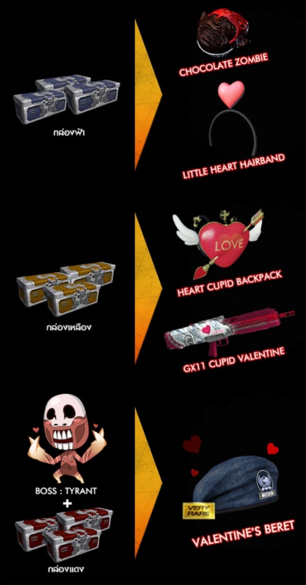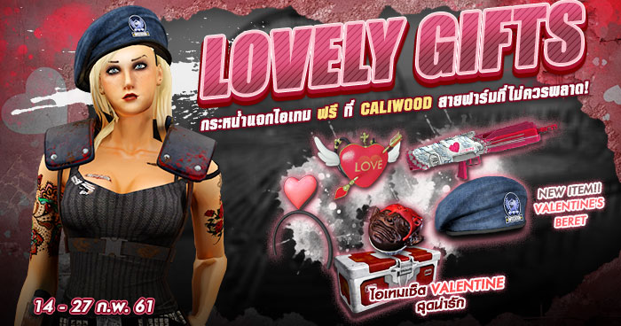 ขอบอกเลยว่าสายฟาร์มห้ามพลาดเลยทีเดียวเพราะกิจกรรมนี้ พี่บี้พร้อมเปย์กระหน่ำแจกไอเท็มฟรีเพียบ เพียงทำการเข้าเล่นเกมแล้วฟาร์มกล่องฟ้า, เหลือง, แดง รวมไปถึงฟาร์มบอส Tyrant ภายในแผนที่ Caliwood เท่านี้ก็มีสิทธิลุ้นรับรางวัลสุดพิเศษอย่างหมวกใหม่สุดน่ารัก Valentine’s Beret สามารถเข้ามาร่วมสนุกกันได้แล้วตั้งแต่วันนี้ถึง 27 กุมภาพันธ์ 2561 นี้เท่านั้น