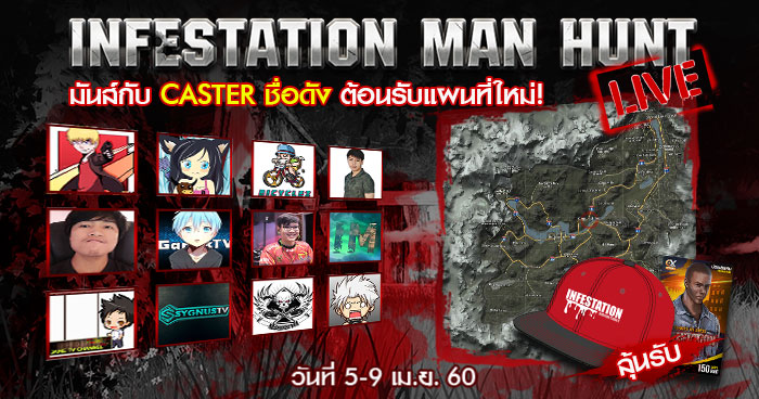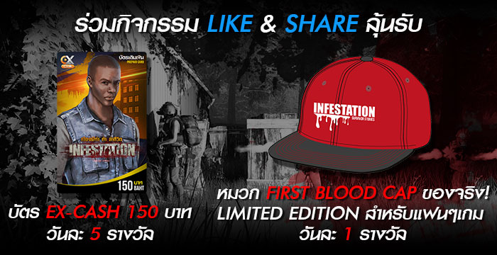 ⦁ ในแต่ละวันร่วมเชียร์และแชร์ลิงก์ถ่ายทอดสดออกไปลุ้นรับ หมวก Infestation FIRST BLOOD วันละ 1 รางวัล และ บัตร Ex-Cash ราคา 150 บาท วันละ 5 รางวัล