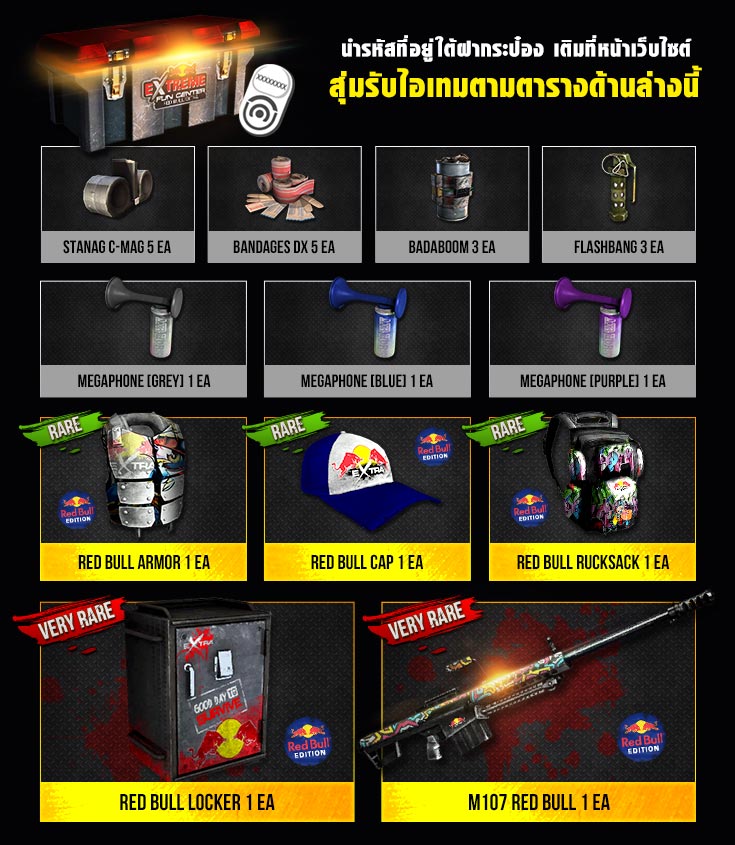 Infestation New World ร่วมกับ Red Bull Extra เสิร์ฟความมันส์ จัดเต็มไอเทมสุดพิเศษให้ Survivor ได้ผจญภัยในดินแดนร้างแห่งใหม่แบบ Extreme เพียงค้นหารหัสใต้ฝาห่วงของเครื่องดื่ม Red Bull Extra รับฟรีทันที สิทธิ์สุ่มลุ้นไอเทมสุด Limited "Red Bull Edition" รีบจัดด่วน!! วันนี้ - 31 มกราคม 2562
