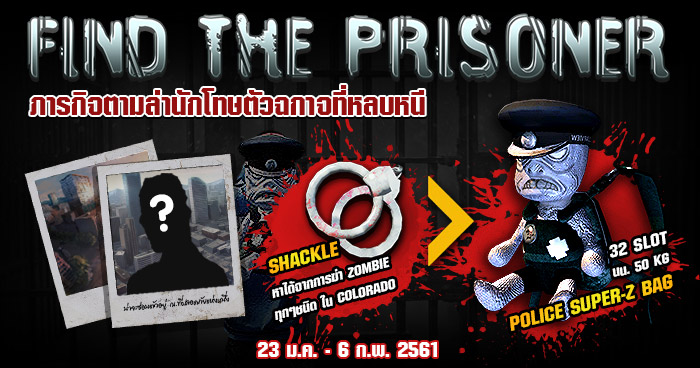 ออกจากห้องคุมขัง และได้ซ่อนตัวอยู่ในสถานที่ปลอดภัยแห่งหนึ่งในรัฐ Colorado สร้างความหวาดกลัวให้กับผู้คนในเมืองต่างๆ ทีมงาน Infestation Thailand จึงขอเชิญชวนเหล่าผู้รอดชีวิตทุกคน มาร่วมค้นหาและตามล่านักโทษตัวฉกาจที่ทำการหลบซ่อนอยู่ ณ.พื้นที่ปลอดภัยแห่งหนึ่งในรัฐ Colorado หากใครเจอและสามารถใช้กุญแจมือ Shackle จับกุมนักโทษได้ จะได้รับกระเป๋า Police Super-Z Bag เป็นของที่ระลึกจากกรมตำรวจ Clearview ฟรี!!