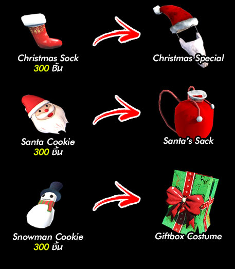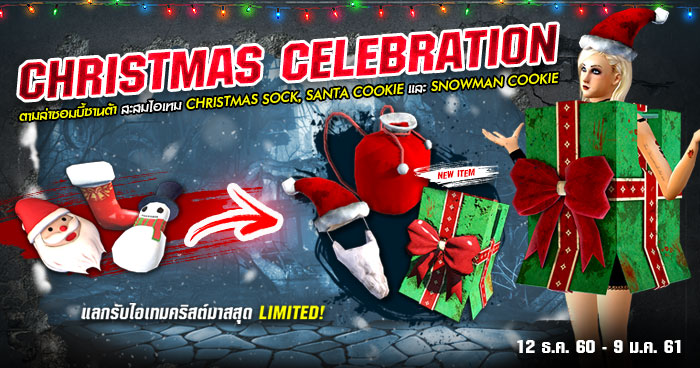 ชวนคุณมาร่วมกำจัดเจ้าซอมบี้ซานต้าให้สิ้นซากพร้อมสะสมไอเทม Christmas Sock, Santa Cookie และ Snowman Cookie นำมาแลกไอเท็มได้ที่ ที่ NPC "Snowy man" ที่บริเวณเซฟโซนบน Blue Ridge Settlement แผนที่ Colorado เพียงเท่านี้คุณก็จะได้ของรางวัลคริสมาสต์สุด Limited ไปครองแบบฟรีๆ โอกาสเดียวเท่านั้นพลาดไม่ได้ของมันต้องมี มาช่วยกันคืนความสุขให้ Christmas Eve นี้ มีแต่ความสุขความสนุกสนานเหมือนเคยได้ตั้งแต่วันนี้ ถึง 9 มกราคม 2561 กันน้า