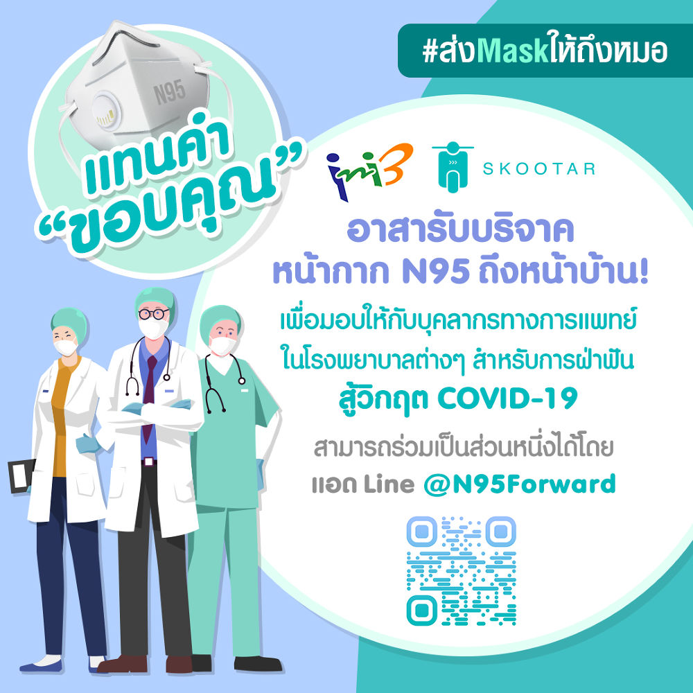 Ini3 ผู้ให้บริการเกมออนไลน์ชั้นนำของประเทศขอนำทัพอาสาช่วยแพทย์ชวนเกมเมอร์และทุกท่านมีส่วนร่วมโครงการ Ini3 x SKOOTAR โดยการร่วมบริจาคหน้ากากอนามัยN95ที่คุณมีอยู่ที่บ้านจากการเหลือใช้ทางเราจะอาสาเป็นตัวแทนในการรวบรวมส่งต่อหน้ากากอนามัย N95 ถึงหน้าบ้าน!เพื่อมอบให้กับคุณหมอและบุคลากรทางการแพทย์ในโรงพยาบาลต่างๆ สำหรับการฝ่าฟันสู้วิกฤต COVID-19โดยสามารถร่วมเป็นส่วนหนึ่งกับโครงการดีๆ ได้ที่ Line @n95forward หรือ https://lin.ee/yOzKIZMมาร่วมส่งMask เป็นกำลังใจให้คุณหมอและบุคลากรทางการแพทย์กันนะคะ