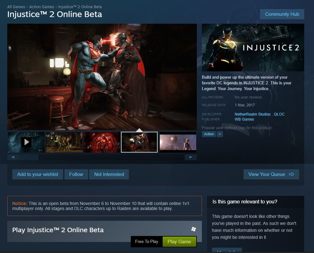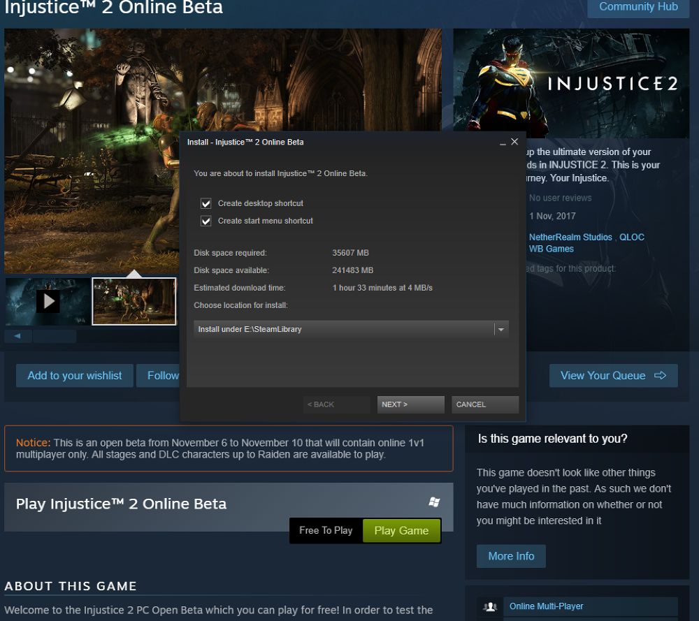 สำหรับเกม Injustice 2 ที่มีรูปแบบเกมเพลย์เป็น Action Arcade จะคล้ายคลึงกับ Street Fighter โดยหยิบนำตัวละครฝั่งดีและฝั่งร้ายของจักรวาล DC Comics ทั้งหมดมารวมกันอยู่ในเกมนี้ จุดเด่นก็คือตัวละครแต่ละตัวจะมีท่าไม้ตายที่แตกต่างและเป็นเอกลักษณ์เฉพาะตัวที่ไม่เหมือนใคร ใครที่อยากลองไปดาวน์โหลดตัวเกมกันได้เลย1. กด ลิงค์ นี้ เพื่อเข้าสู่หน้าร้านค้าของ Injustice 2 (หรือจะกดปุ่ม INSTALL GAME ด้านล่างนี้ก็ได้นะครับ)2. ตัวเกมจะให้คุณเลือกว่าจะติดตั้งที่ไดร์ฟในของคอมพิวเตอร์ โดยตัวเกมช่วงเบต้านี้จะใช้พื้นที่ในฮาร์ดดิสก์ประมาณ 35GB. เมื่อโหลดเสร็จแล้วก็เข้าไปเลือกฮีโร่หรือตัวร้ายที่ชื่นชอบแล้วลุยกันได้เลย!