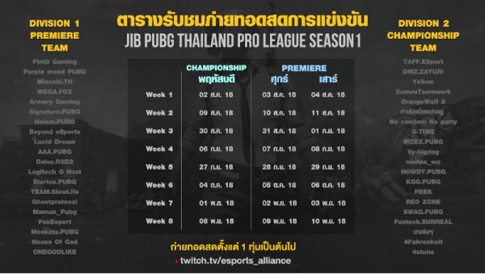 หลังจากการเปิดคัดเลือกเราก็ได้ 40 ทีม ที่แบ่งออกเป็น 2 ดิวิชั่น ได้แก่ Premier League 20ทีมและ Championship 20ทีม เข้าร่วมการแข่งขันในลีก PUBG ครั้งแรกในประเทศไทย การแข่งขันใน Premier League 15ทีมที่มีคะแนนดีที่สุดจะได้ไปเล่นในรอบออฟไลน์ที่ร้าน Mine café สาขารังสิต เพื่อชิงเงินรางวัลอีก 1 ครั้ง  ในขณะเดียวกัน 5 ทีมสุดท้ายจะต้องตกไปเล่นใน Championship League  ส่วน 5ทีมที่ทำคะแนนดีที่สุดของ Championship League จะขึ้นสู่ลีกสูงสุดทันที!!  บอกได้เลยว่างานนี้เดือดตลอดฤดูกาลแน่นอน!