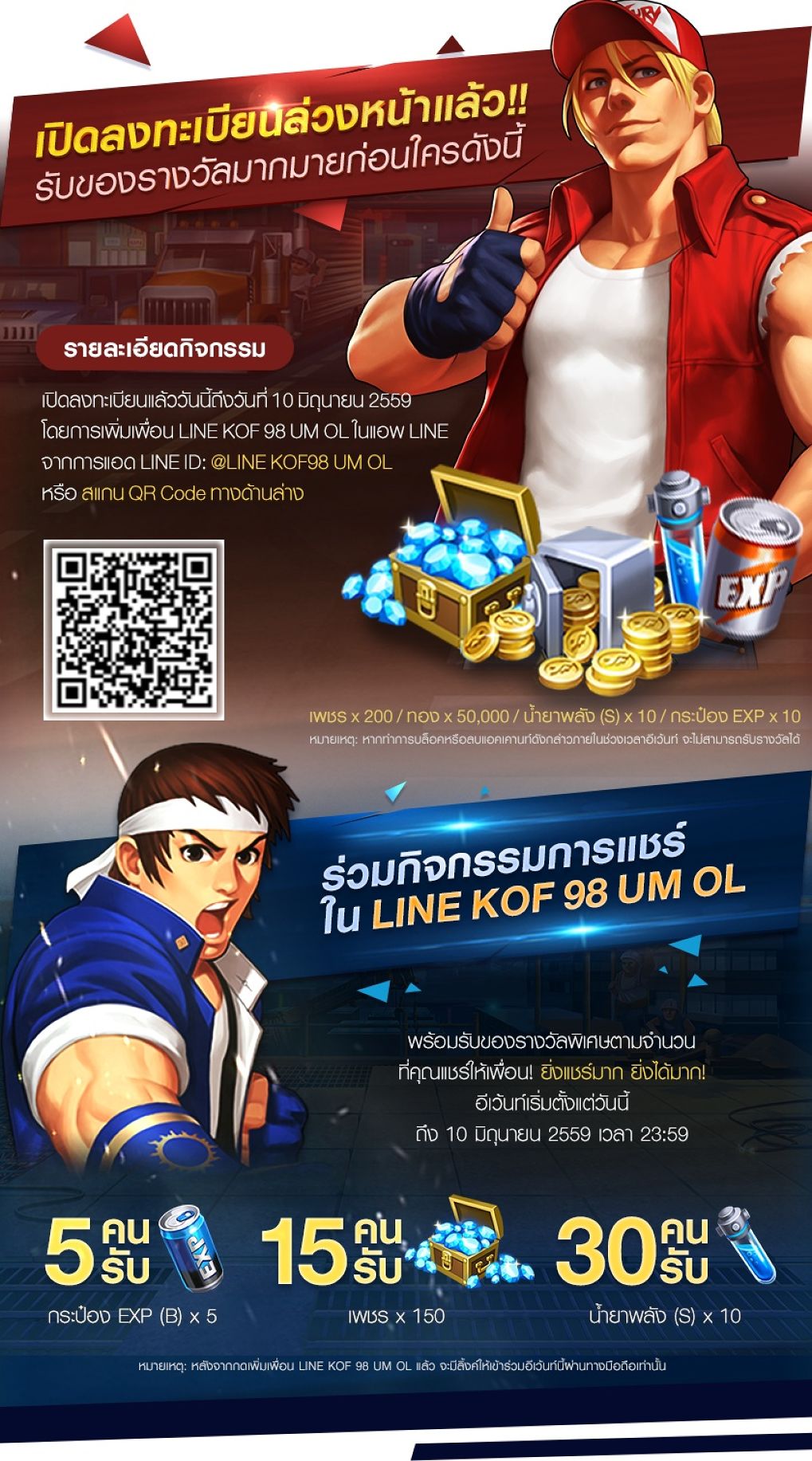 ถือว่าเป็นข่าวดีสำหรับคอเกม Fighting ต่อย ๆ โยน ๆ กันเลยทีเดียว เพราะ LINE บริษัทผู้ให้บริการแอพพลิเคชั่นและเกมโทรศัพท์มือถือในประเทศไทย ได้ออกมาประกาศเปิด Pre-Register เกม KOF98 ULTIMATE MATCH ONLINE สุดยอดเกม Spin-off จากเกมต่อสู้ชื่อดังอย่าง The King of Fighter เกมต่อสู้ในตำนานที่เคยลงให้กับเครื่อง PSX PS2 PS3 และตู้อาเขตอีกมากมาย โดยคาดว่าจะเปิดให้บริการได้ภายในเดือนมิถุนายนนี้