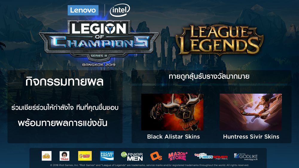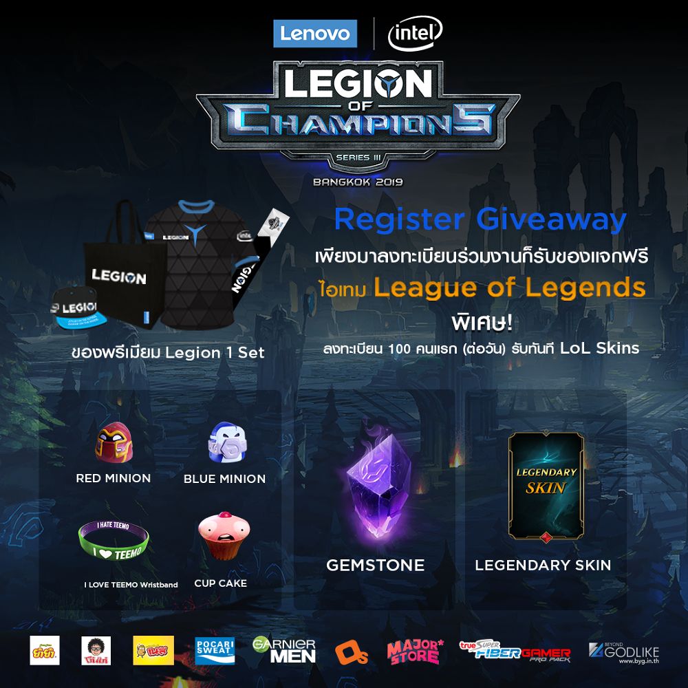 เปิดตัวอย่างเป็นทางการเป็นที่เรียบร้อยแล้วสำหรับการแข่งขันอันยิ่งใหญ่ในรายการ Legion of Champions ครั้งที่3  การแข่งขัน เกม League of Legends ระดับเอเชีย ที่ประเทศไทยของเราเป็นเจ้าภาพจัดการแข่งขันที่สนาม BCC Hall ชั้น 5 เซ็นทรัล ลาดพร้าว ระหว่างวันที่ 25-27 มกราคม 2019 พบกับกิจรรมมากมายภายในงาน ที่สำคัญคือ ฟรีตลอดงาน!!