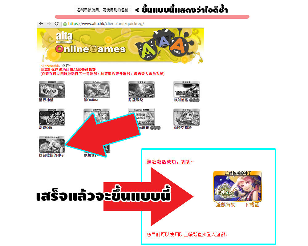 เมื่อกดเลือกเกมเสร็จจะขึ้นข้อความยืนยัน พร้อมภาพเกมแบบมีสี (ดังรูป) เป็นอันเสร็จสิ้นการสมัครไอดีแบบไว