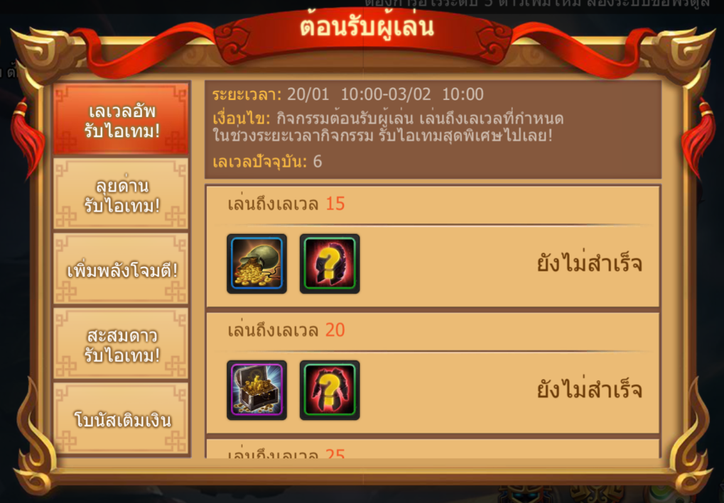 เงื่อนไขกิจกรรม : รับของรางวัลทุกๆ 5 เลเวล ตั้งแต่เลเวล 15 - 50