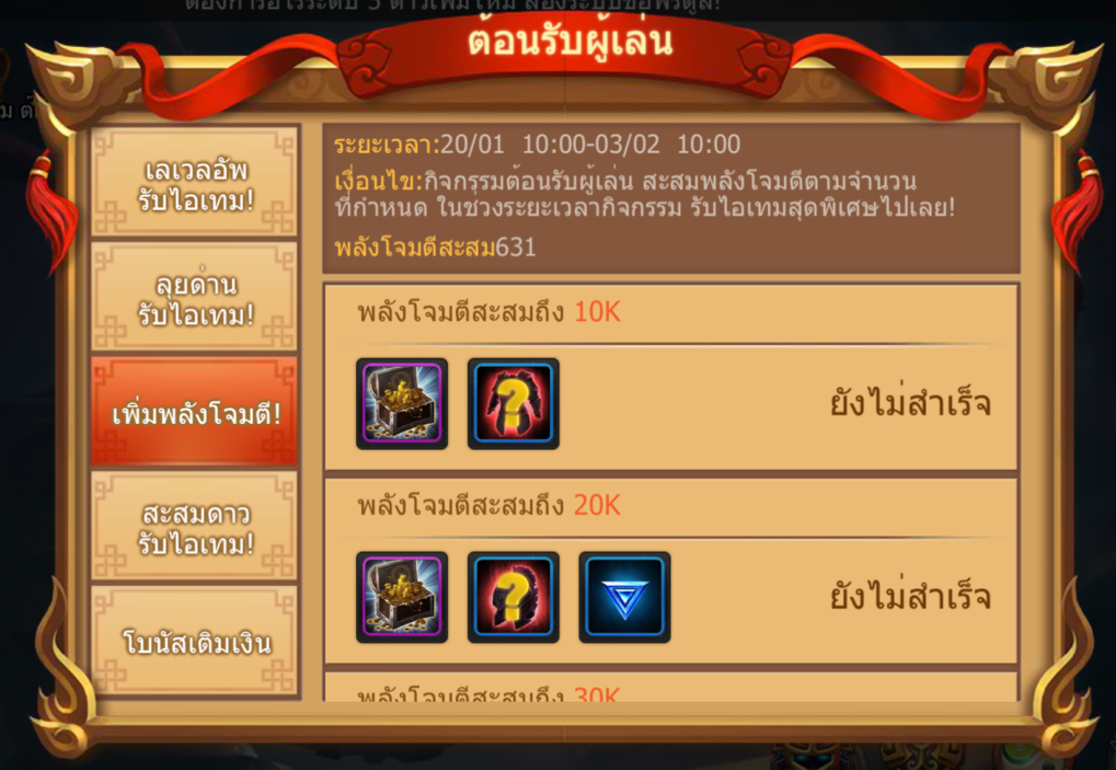 เงื่อนไขกิจกรรม : สะสมพลังโจมตีให้ถึงที่กำหนดเพื่อรับรางวัลโดยสามารถรับรางวัลได้ตั้งแต่ 10k - 50K